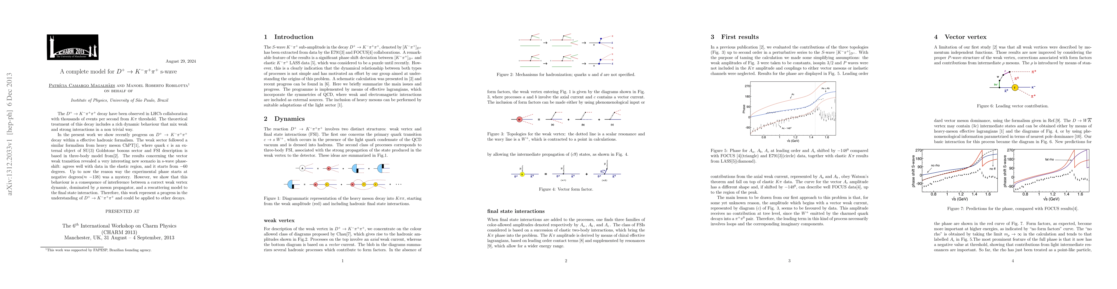 The $D^+ \to K^-\pi^+\pi+$ decay have been observed in LHCb collaboration with thousands of events per second from $K\pi$ threshold. The theoretical treatment of this decay includes a rich dynamic behaviour that mix weak and strong interactions in a non trivial way. In the present work we show recently progress on $D^+ \to K^-\pi^+\pi+$ decay within a effective hadronic formalism. The weak sector followed a similar formalism from heavy meson ChPT, where quark c is an external object of SU(3) Goldstone bosons sector and final states interactions description is based in three-body model. The results concerning the vector weak transition revealed a very interesting new scenario in s-wave phase-shift: agrees well with data in the elastic region, and it starts from $-60$ degrees. Up to now the reason way the experimental phase starts at negative degrees($\approx - 138$) was a mystery. However, we show that this behaviour is a consequence of interference between a correct weak vertex dynamic, dominated by $\rho$ meson propagator, and a rescattering model to the final state interaction. Therefore, this work represent a progress in the understanding of $D^+ \to K^-\pi^+\pi+$ and could be applied to other decays.
