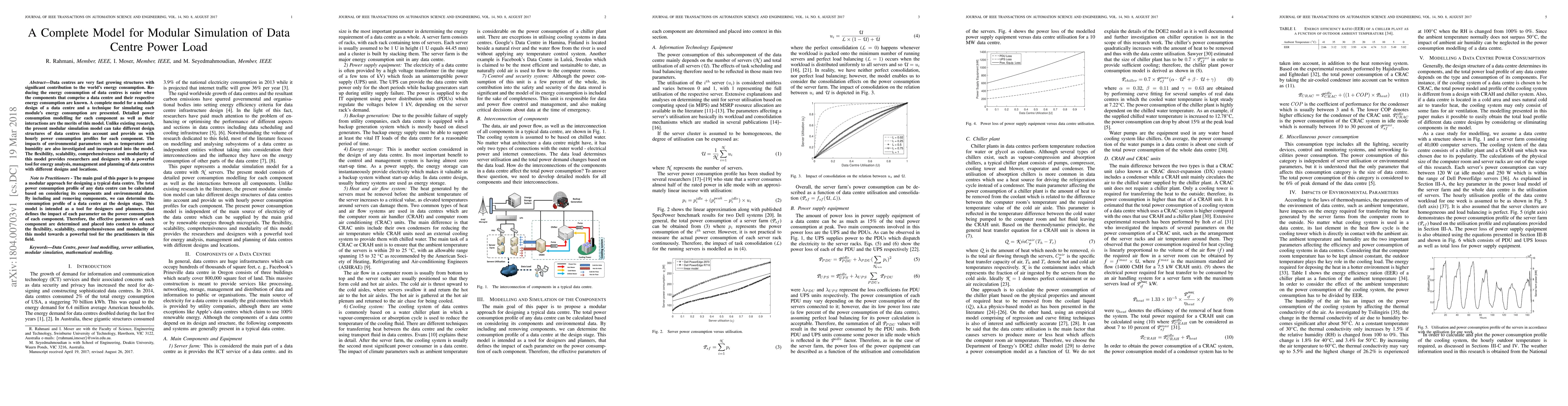 Data centres are very fast growing structures with significant contribution to the world's energy consumption. Reducing the energy consumption of data centres is easier when the components that comprise a data centre and their respective energy consumption are known. A complete model for a modular design of a data centre and a technique for simulating each module's energy consumption are presented. Detailed power consumption modelling for each component as well as their interactions are the merits of this model. Unlike existing research, the present modular simulation model can take different design structures of data centres into account and provide us with hourly power consumption profiles for each component. The impacts of environmental parameters such as temperature and humidity are also investigated and incorporated into the model. The flexibility, scalability, comprehensiveness and modularity of this model provides researchers and designers with a powerful tool for energy analysis, management and planning of data centres with different designs and locations.