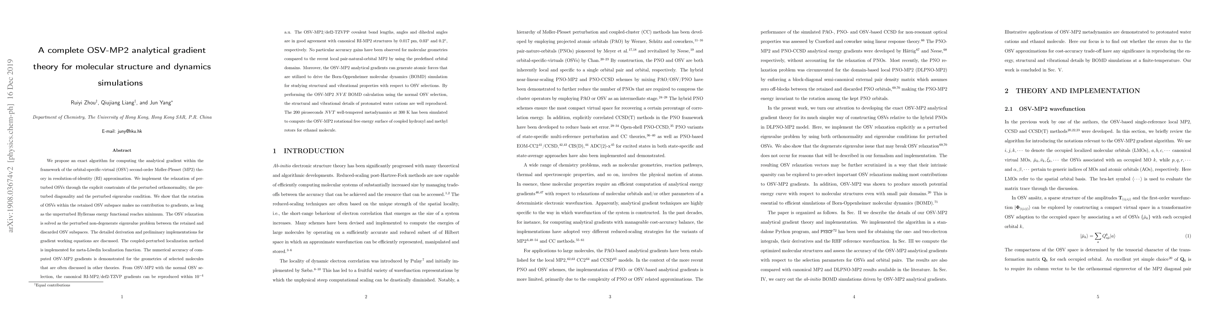 We propose an exact algorithm for computing the analytical gradient within the framework of the orbital-specific-virtual (OSV) second-order M{\o}ller-Plesset (MP2) theory in resolution-of-identity (RI) approximation. We implement the exact relaxation of perturbed OSVs through the explicit constraints of the perturbed orthonormality, the perturbed diagonality and the perturbed singular value condition. We explicitly show that the rotation of OSVs within the retained OSV subspace makes no contribution to gradients, as long as the iterative solution of the unperturbed Hylleraas residual equation is well converged. The OSV relaxation is solved as the perturbed non-degenerate singular value problem between the retained and discarded OSV subspaces. The detailed derivation and preliminary implementations for gradient working equations are discussed. The coupled-perturbed localization method is implemented for meta-L\"owdin localization function. The numerical accuracy of computed OSV-MP2 gradients is demonstrated for the geometries of selected molecules that are often discussed in other theories. Moreover, the OSV-MP2 analytical gradients can generate atomic forces that are utilized to drive the Born-Oppenheimer molecular dynamics (BOMD) simulation for studying structural and vibrational properties with respect to OSV selections. By performing the OSV-MP2 NVE BOMD calculation using the normal OSV selection, the structural and vibrational details of protonated water cations are well reproduced. The 200 picoseconds NVT well-tempered metadynamics at 300 K has been simulated to compute the OSV-MP2 rotational free energy surface of coupled hydroxyl and methyl rotors for ethanol molecule.