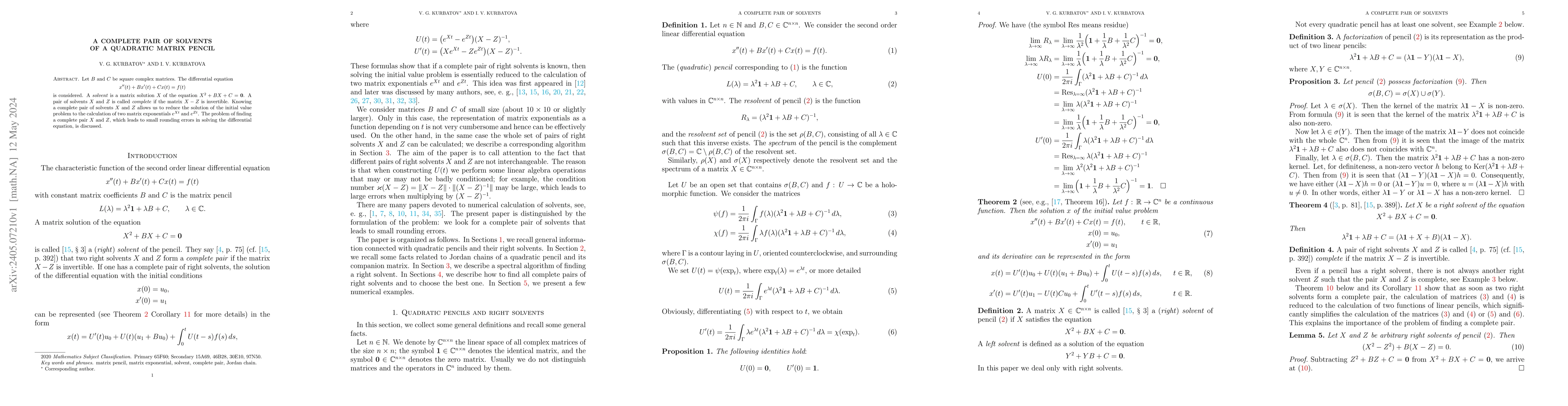 Let $B$ and $C$ be square complex matrices. The differential equation \begin{equation*} x''(t)+Bx'(t)+Cx(t)=f(t) \end{equation*} is considered. A solvent is a matrix solution $X$ of the equation $X^2+BX+C=\mathbf0$. A pair of solvents $X$ and $Z$ is called complete if the matrix $X-Z$ is invertible. Knowing a complete pair of solvents $X$ and $Z$ allows us to reduce the solution of the initial value problem to the calculation of two matrix exponentials $e^{Xt}$ and $e^{Zt}$. The problem of finding a complete pair $X$ and $Z$, which leads to small rounding errors in solving the differential equation, is discussed.