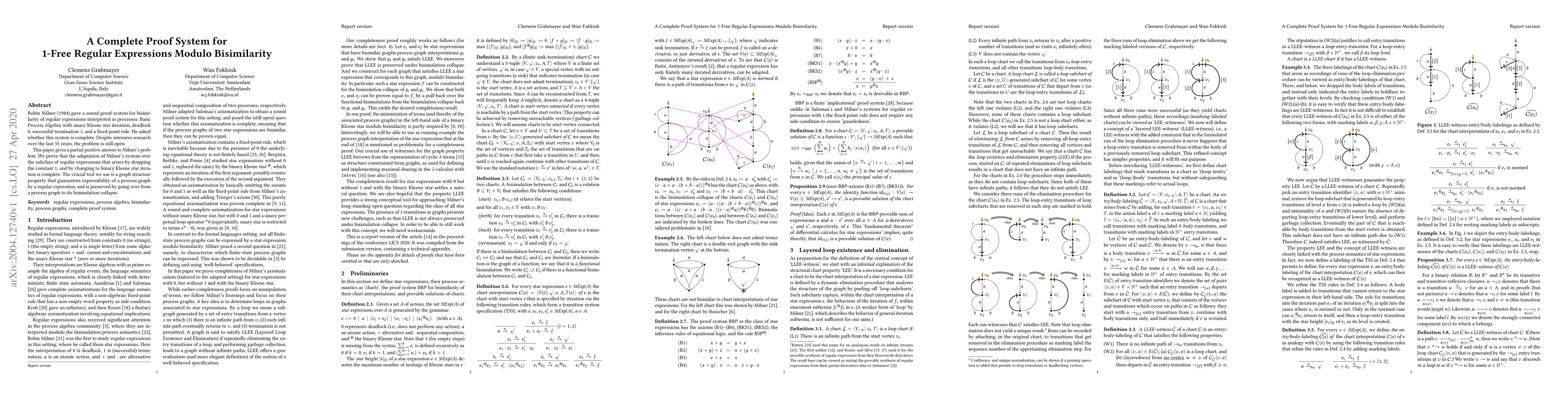 This paper resolves a longstanding question by proving that a modified version of Milner's proof system for bisimilarity is complete for a subclass of regular expressions that excludes the constant 1 and uses binary Kleene star iteration. The completeness is achieved using a graph structure property that ensures expressibility and is preserved under bisimulation collapse.