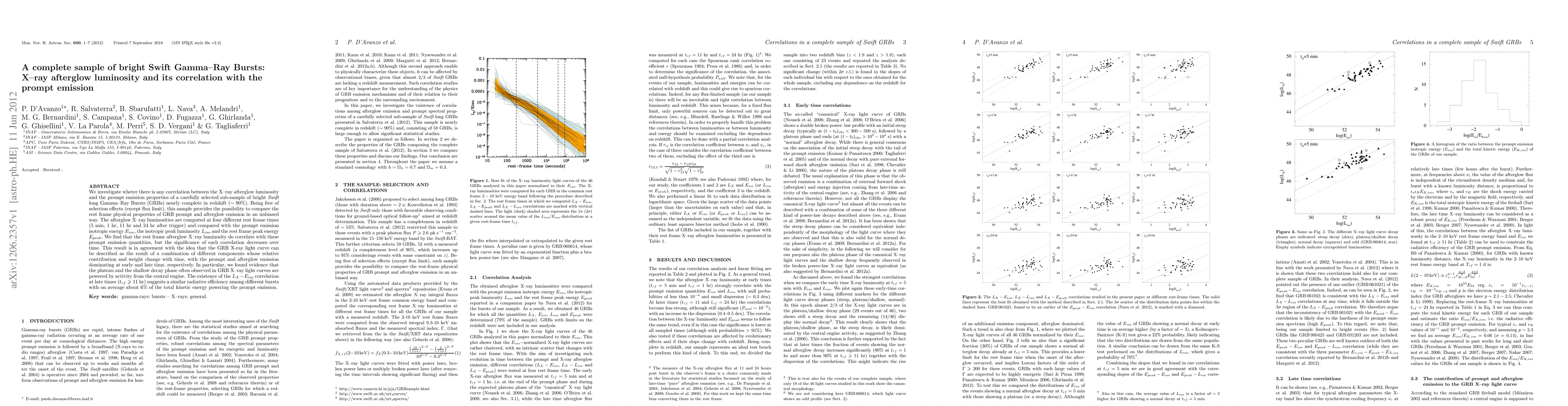We investigate wheter there is any correlation between the X-ray afterglow luminosity and the prompt emission properties of a carefully selected sub-sample of bright Swift long Gamma-Ray Bursts (GRBs) nearly complete in redshift (~90%). Being free of selection effects (except flux limit), this sample provides the possibility to compare the rest frame physical properties of GRB prompt and afterglow emission in an unbiased way. The afterglow X-ray luminosities are computed at four different rest frame times (5 min, 1 hr, 11 hr and 24 hr after trigger) and compared with the prompt emission isotropic energy E_iso, the isotropic peak luminosity L_iso and the rest frame peak energy E_peak. We find that the rest frame afterglow X-ray luminosity do correlate with these prompt emission quantities, but the significance of each correlation decreases over time. This result is in agreement with the idea that the GRB X-ray light curve can be described as the result of a combination of different components whose relative contribution and weight change with time, with the prompt and afterglow emission dominating at early and late time, respectively. In particular, we found evidence that the plateau and the shallow decay phase often observed in GRB X-ray light curves are powered by activity from the central engine. The existence of the L_X-E_iso correlation at late times (t_rf > 11 hr) suggests a similar radiative efficiency among different bursts with on average about 6% of the total kinetic energy powering the prompt emission.