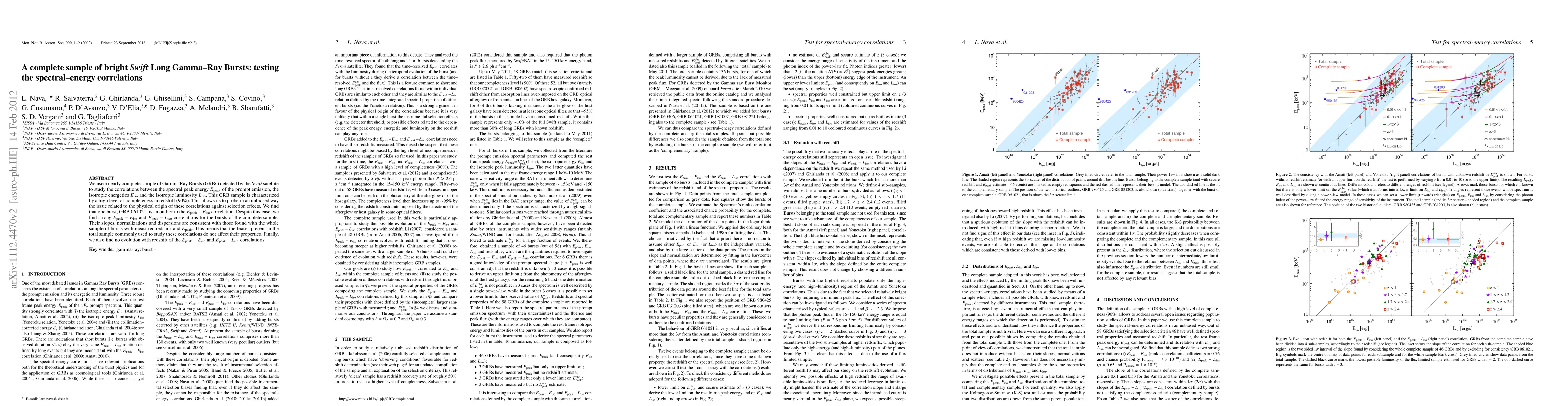 We use a nearly complete sample of Gamma Ray Bursts (GRBs) detected by the Swift satellite to study the correlations between the spectral peak energy Ep of the prompt emission, the isotropic energetics Eiso and the isotropic luminosity Liso. This GRB sample is characterized by a high level of completeness in redshift (90%). This allows us to probe in an unbiased way the issue related to the physical origin of these correlations against selection effects. We find that one burst, GRB 061021, is an outlier to the Ep-Eiso correlation. Despite this case, we find strong Ep-Eiso and Ep-Liso correlations for the bursts of the complete sample. Their slopes, normalisations and dispersions are consistent with those found with the whole sample of bursts with measured redshift and Ep. This means that the biases present in the total sample commonly used to study these correlations do not affect their properties. Finally, we also find no evolution with redshift of the Ep-Eiso and Ep-Liso correlations.
