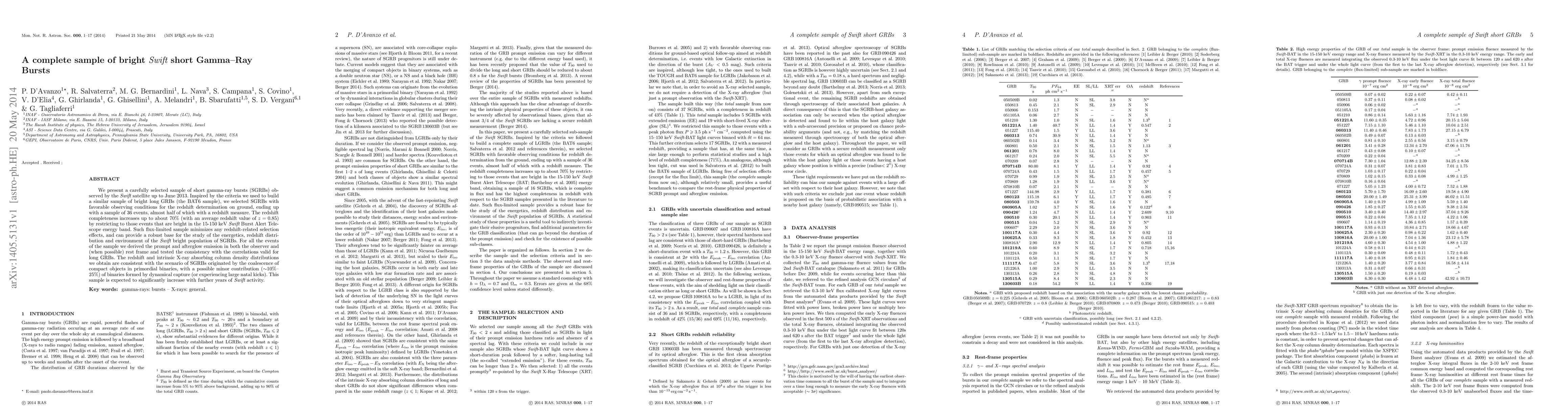 This paper presents a complete sample of 36 bright short gamma-ray bursts (SGRBs) observed by the Swift satellite up to June 2013, with nearly half having measured redshifts. The sample is flux-limited, minimizing selection biases and providing a robust basis for studying SGRB energetics and environments.