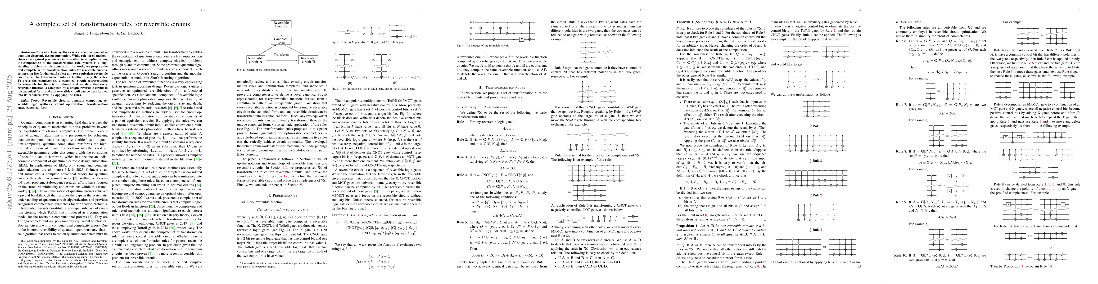Reversible logic synthesis is a crucial component in quantum electronic design automation. While rule-based methodologies have gained prominence in reversible circuit optimization, the completeness of the transformation rule systems is a longstanding problem in this domain. In this work, we propose the first complete set of transformation rules for reversible circuits, comprising five fundamental rules: any two equivalent reversible circuits can be transformed into each other using the rules. To prove the completeness, a canonical circuit representation for reversible functions is introduced, and we show that every reversible function is computed by a unique reversible circuit in the canonical form, and any reversible circuit can be transformed into its canonical form by applying the rules.