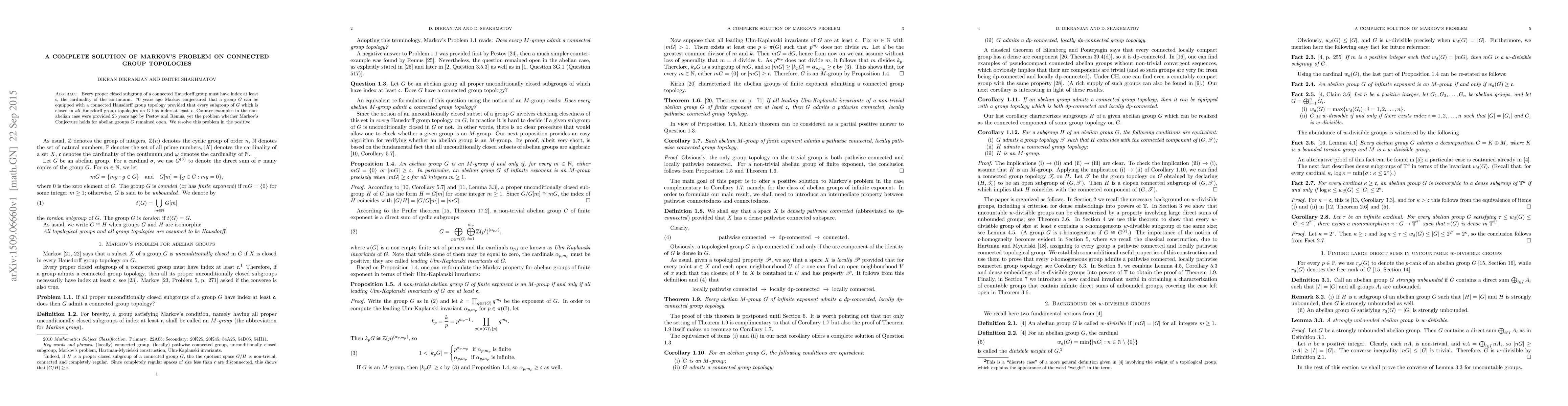 Summary: Markov's conjecture regarding the existence of a connected Hausdorff group topology for abelian groups, where every proper closed subgroup has index at least the cardinality of the continuum, is proven to be true. This resolves the longstanding open question for abelian groups.