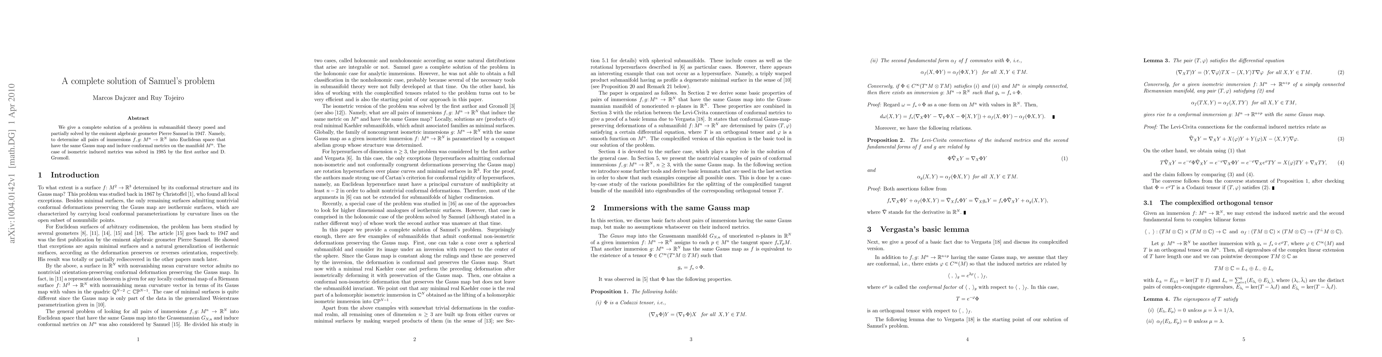 We give a complete solution of a problem in submanifold theory posed and partially solved by the eminent algebraic geometer Pierre Samuel in 1947. Namely, to determine all pairs of immersions of a given manifold into Euclidean space that have the same Gauss map and induce conformal metrics on the manifold. The case of isometric induced metrics was solved in 1985 by the first author and D. Gromoll.