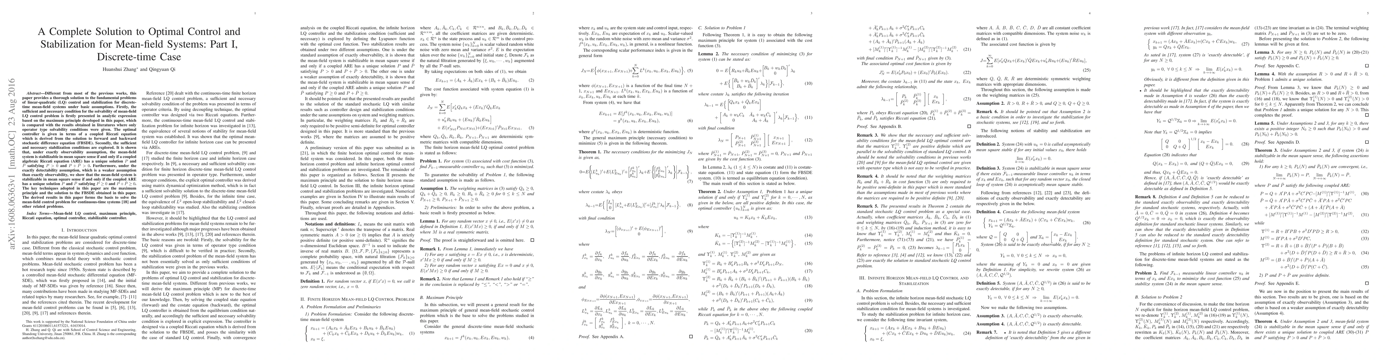 This paper presents a complete solution for optimal control and stabilization of discrete-time mean-field systems, providing analytic expressions for solvability conditions and deriving an optimal controller via coupled Riccati equations. It establishes stabilization conditions under observability and detectability assumptions, forming a foundation for continuous-time systems and related problems.
