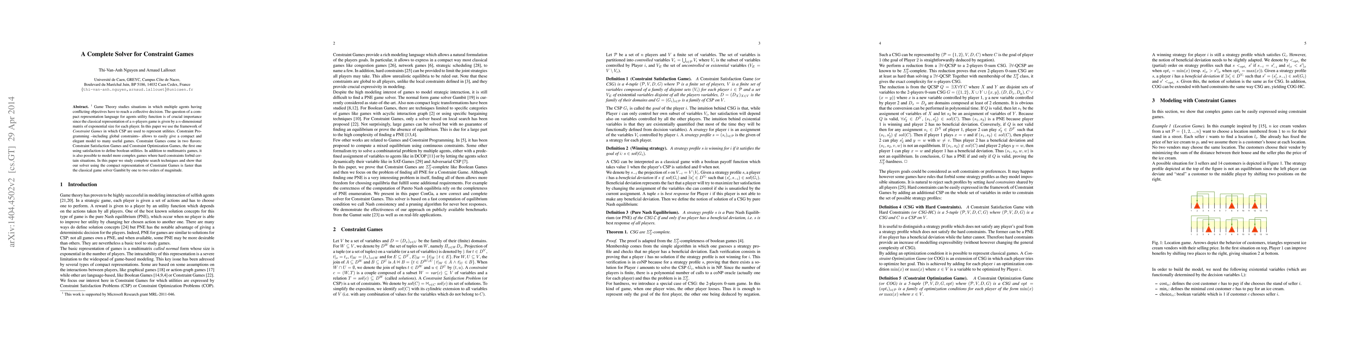 The paper proposes a complete solver for Constraint Games using Constraint Programming, representing utilities with Constraint Satisfaction Problems (CSP) and global constraints. It focuses on complete search techniques for both Constraint Satisfaction Games and Constraint Optimization Games, demonstrating that the proposed solver outperforms the classical Gambit solver by one to two orders of magnitude.