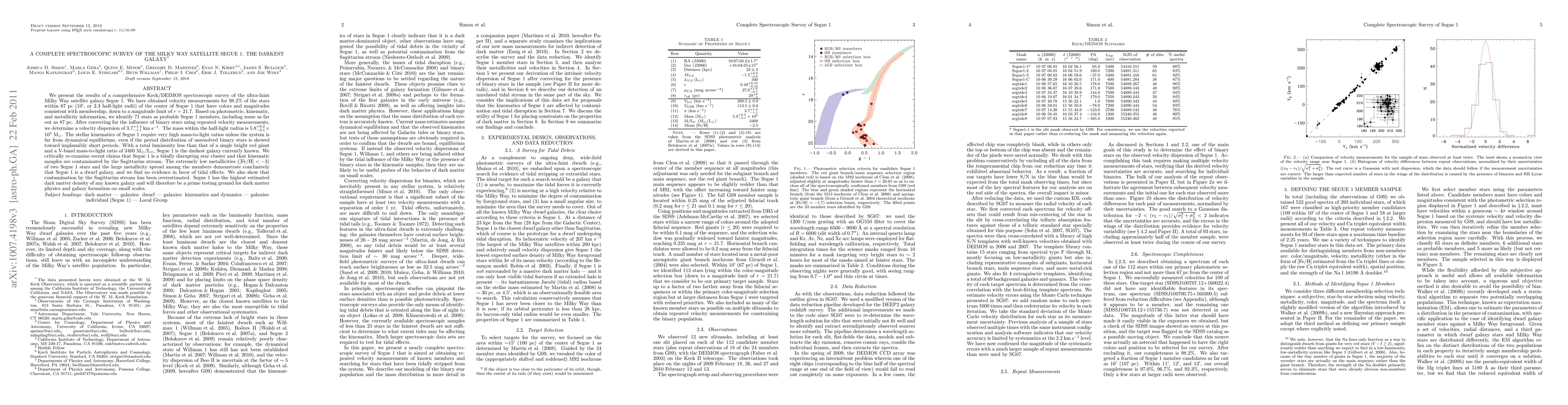 This paper reports a spectroscopic survey of the ultra-faint Milky Way satellite galaxy Segue 1, identifying 71 probable members and determining a high velocity dispersion and mass-to-light ratio, confirming it as the darkest galaxy known. The study refutes claims of tidal disruption and Sagittarius stream contamination.