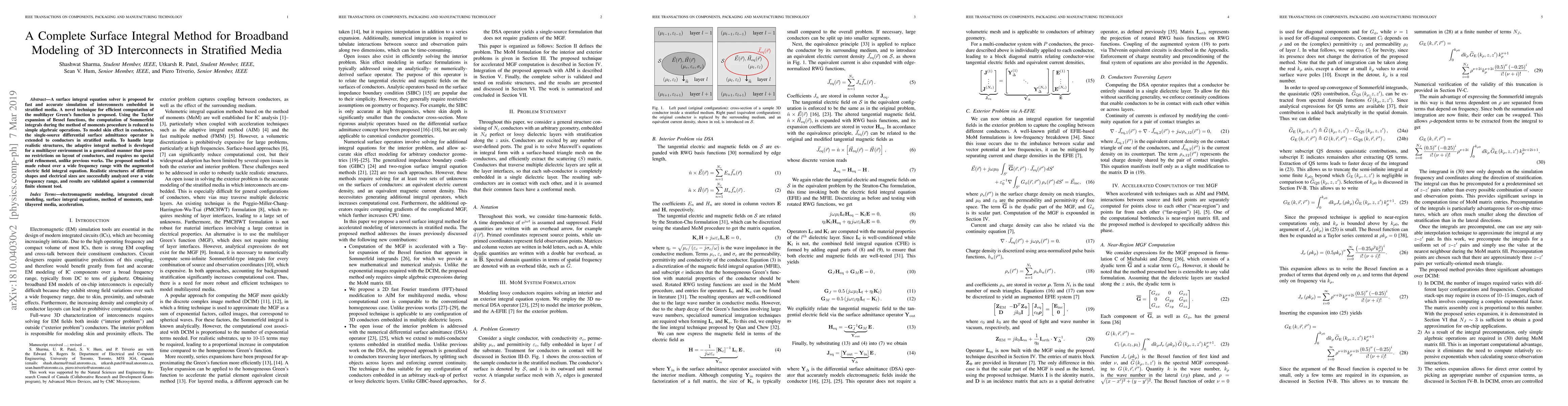 This paper proposes a surface integral method for broadband modeling of 3D interconnects in stratified media, utilizing a novel technique for efficient computation of the multilayer Green's function and an adaptive integral method for large structures. The method is validated across a wide frequency range and compared against a commercial finite element tool.