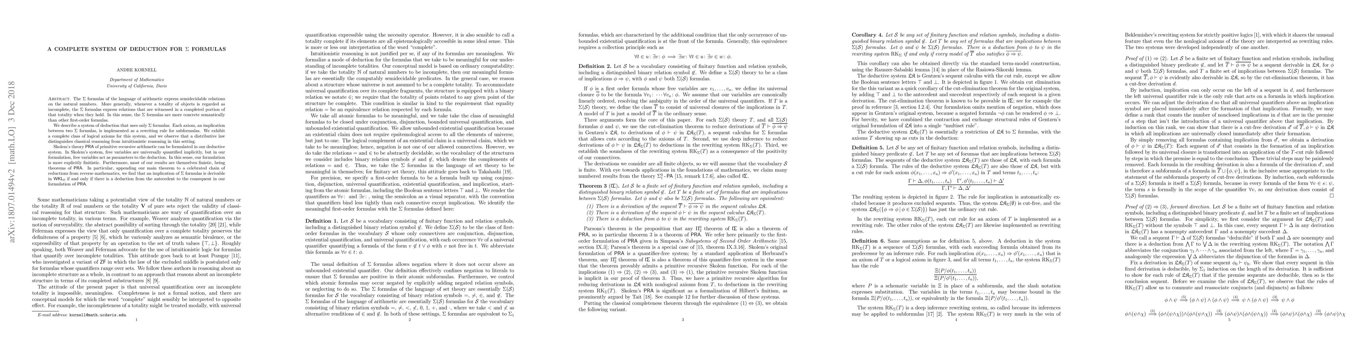 Researchers developed a system of deduction using only Sigma formulas, which express semidecidable relations on natural numbers. This system can formalize Skolem's theory PRA of primitive recursive arithmetic and has implications for reverse mathematics.