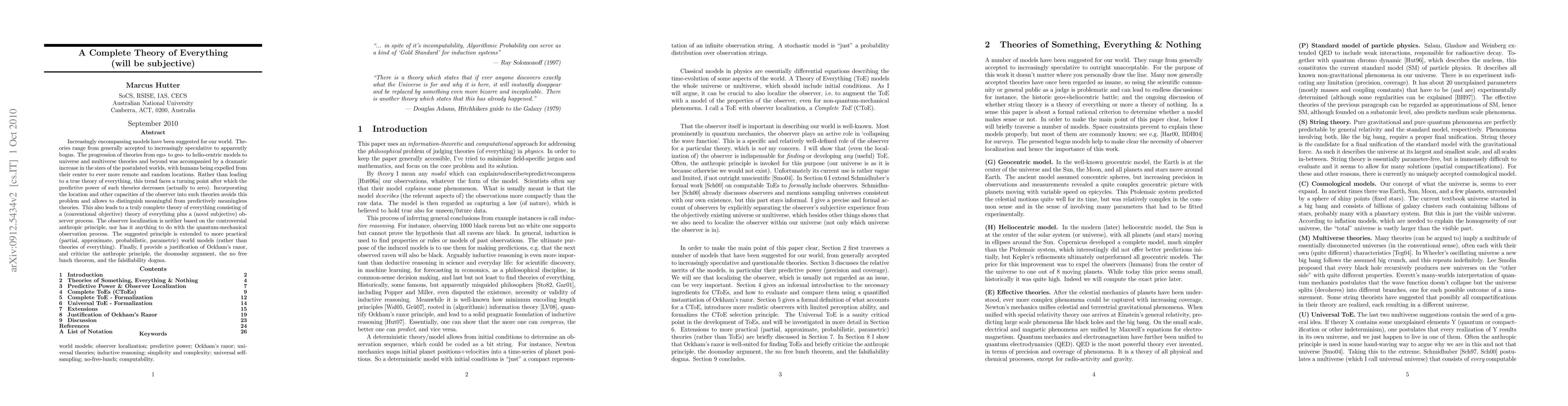 Increasingly encompassing models have been suggested for our world. Theories range from generally accepted to increasingly speculative to apparently bogus. The progression of theories from ego- to geo- to helio-centric models to universe and multiverse theories and beyond was accompanied by a dramatic increase in the sizes of the postulated worlds, with humans being expelled from their center to ever more remote and random locations. Rather than leading to a true theory of everything, this trend faces a turning point after which the predictive power of such theories decreases (actually to zero). Incorporating the location and other capacities of the observer into such theories avoids this problem and allows to distinguish meaningful from predictively meaningless theories. This also leads to a truly complete theory of everything consisting of a (conventional objective) theory of everything plus a (novel subjective) observer process. The observer localization is neither based on the controversial anthropic principle, nor has it anything to do with the quantum-mechanical observation process. The suggested principle is extended to more practical (partial, approximate, probabilistic, parametric) world models (rather than theories of everything). Finally, I provide a justification of Ockham's razor, and criticize the anthropic principle, the doomsday argument, the no free lunch theorem, and the falsifiability dogma.