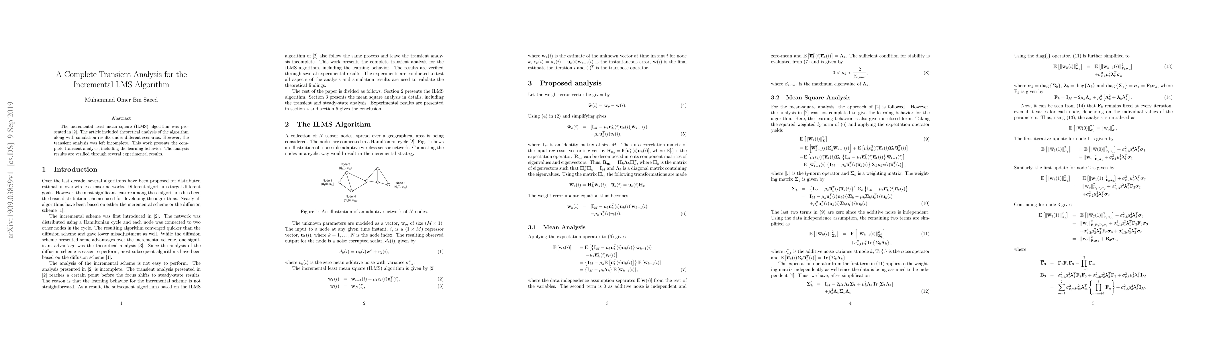 This paper presents a complete transient analysis of the incremental LMS algorithm, providing detailed understanding of its learning behavior and verifying results through experimental validation.