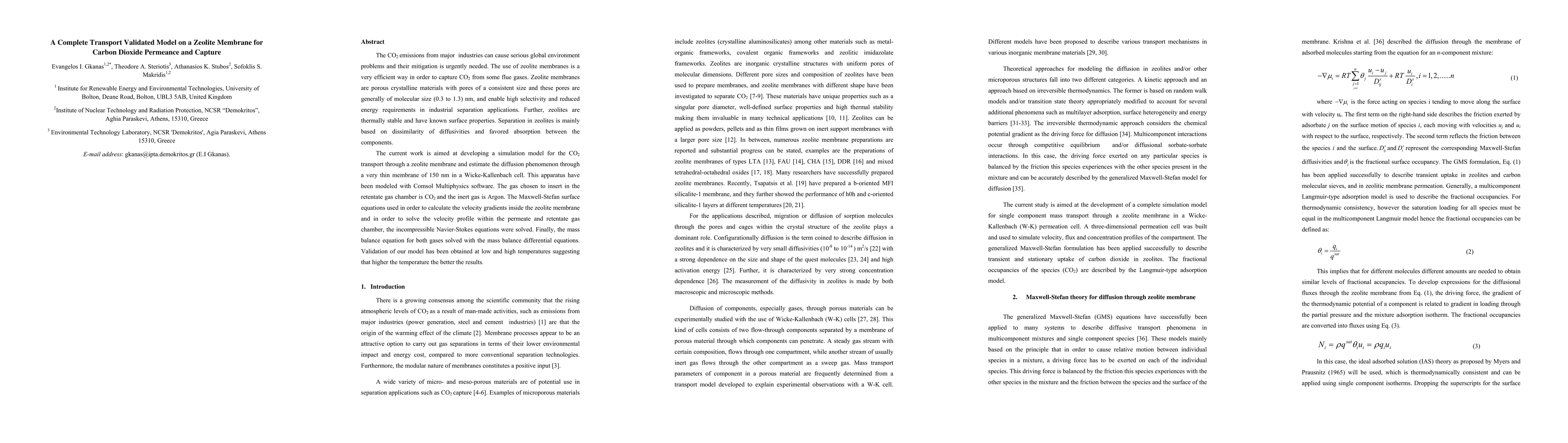 The CO2 emissions from major industries cause serious global environment problems and their mitigation is urgently needed. The use of zeolite membranes is a very efficient way in order to capture CO2 from some flue gases. The dominant transport mechanism at low temperature andor high pressure is the diffusion through the membrane. This procedure can be divided in three steps: Adsorption of the molecules of the species in the surface of the membrane, then a driving force gives a path where the species follow inside the membrane and finally the species desorbed from the surface of the membrane. The current work is aimed at developing a simulation model for the CO2 transport through a zeolite membrane and estimate the diffusion phenomenon through a very thin membrane of 150 nm in a Wicke-Kallenbach cell. The cell is cylindrical in shape with diameter of 19 mm and consists of a retentate gas chamber, a permeate gas chamber which are separated by a cylindrical zeolite membrane. This apparatus have been modeled with Comsol Multiphysics software. The gas chosen to insert in the retentate gas chamber is CO2 and the inert gas is Argon. The Maxwell-Stefan surface equations used in order to calculate the velocity gradients inside the zeolite membrane and in order to solve the velocity profile within the permeate and retentate gas chamber, the incompressible Navier-Stokes equations were solved. Finally, the mass balance equation for both gases solved with the mass balance differential equations. Validation of our model has been obtained at low and high temperatures suggesting that higher the temperature the better the results.