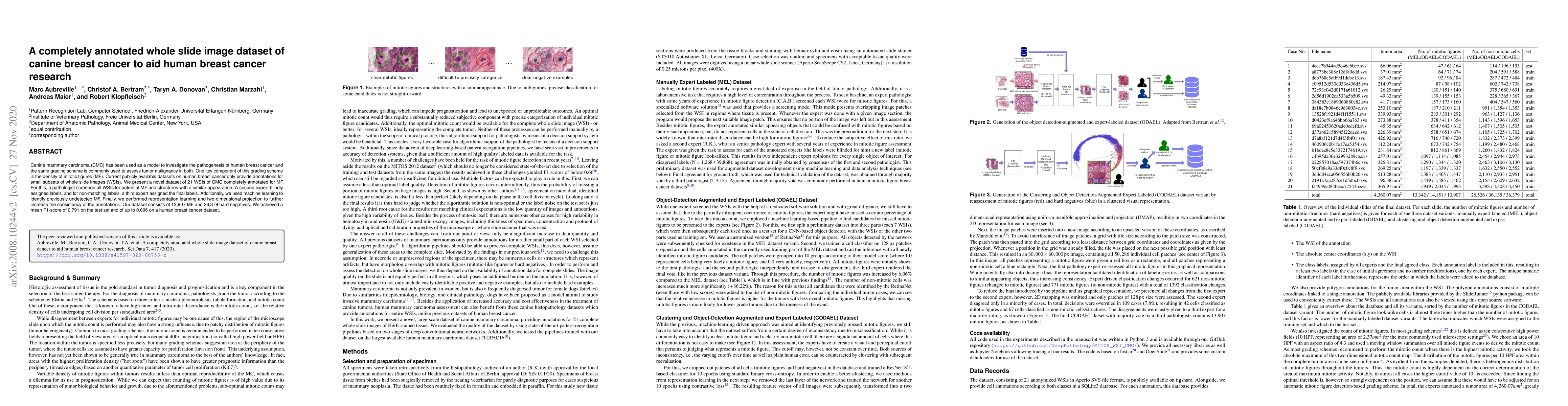 Canine mammary carcinoma (CMC) has been used as a model to investigate the pathogenesis of human breast cancer and the same grading scheme is commonly used to assess tumor malignancy in both. One key component of this grading scheme is the density of mitotic figures (MF). Current publicly available datasets on human breast cancer only provide annotations for small subsets of whole slide images (WSIs). We present a novel dataset of 21 WSIs of CMC completely annotated for MF. For this, a pathologist screened all WSIs for potential MF and structures with a similar appearance. A second expert blindly assigned labels, and for non-matching labels, a third expert assigned the final labels. Additionally, we used machine learning to identify previously undetected MF. Finally, we performed representation learning and two-dimensional projection to further increase the consistency of the annotations. Our dataset consists of 13,907 MF and 36,379 hard negatives. We achieved a mean F1-score of 0.791 on the test set and of up to 0.696 on a human breast cancer dataset.