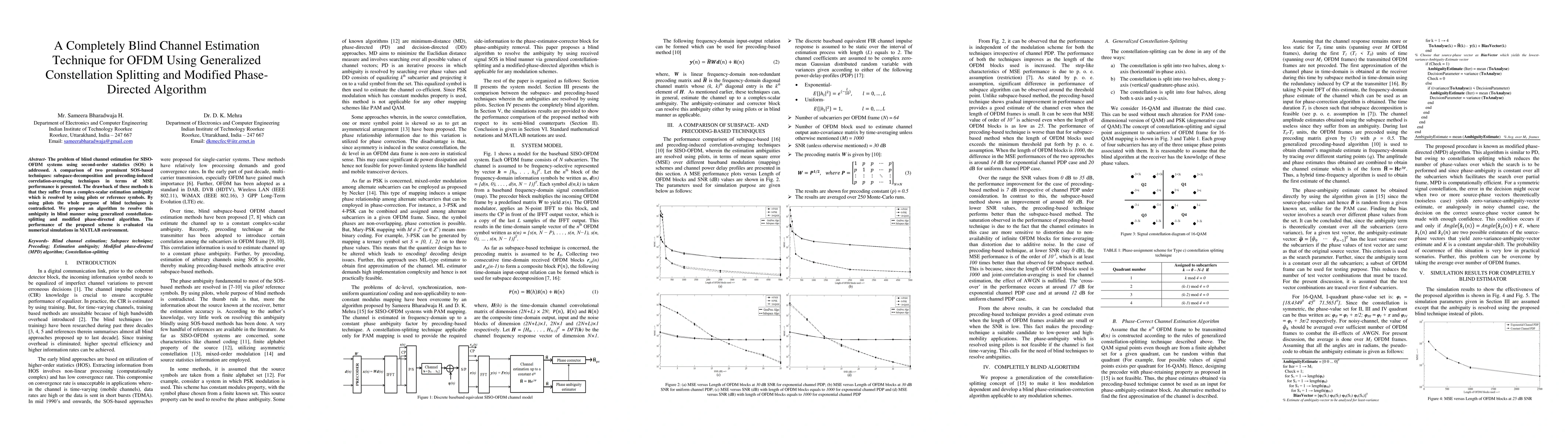 The problem of blind channel estimation for SISO-OFDM systems using second-order statistics (SOS) is addressed. A comparison of two prominent SOS-based techniques: subspace-decomposition and precoding-induced correlation-averaging techniques in terms of MSE performance is presented. The drawback of these methods is that they suffer from a complex-scalar estimation ambiguity which is resolved by using pilots or reference symbols. By using pilots the whole purpose of blind techniques is contradicted. We propose an algorithm to resolve this ambiguity in blind manner using generalized constellation-splitting and modified phase-directed algorithm. The performance of the proposed scheme is evaluated via numerical simulations in MATLAB environment.