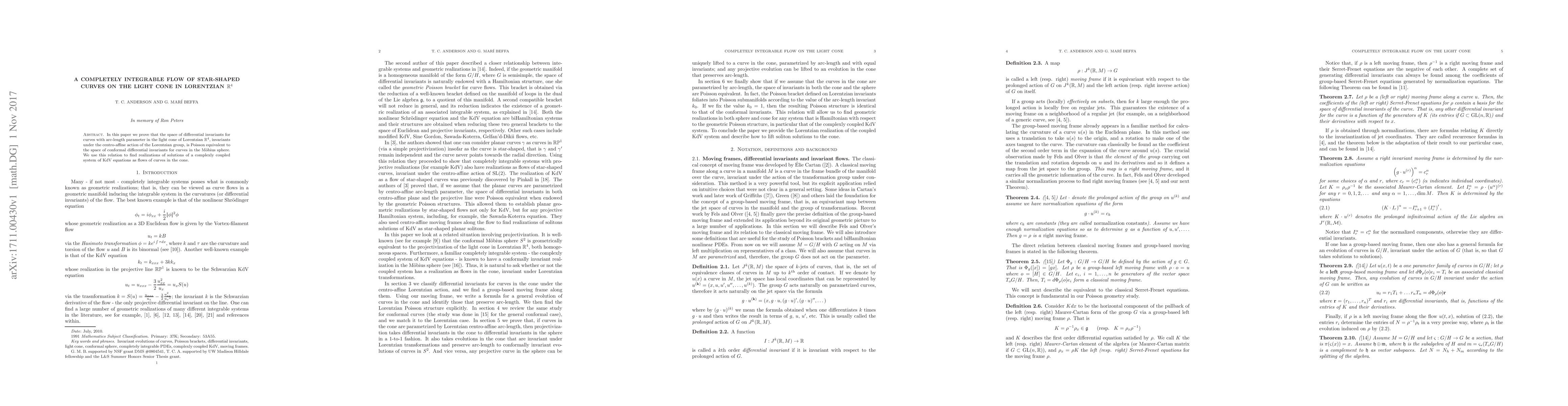 This research establishes that the set of symmetries for star-shaped curves on the light cone in Lorentzian 4D space is Poisson equivalent to the set for curves on the Möbius sphere. This connection helps find real solutions for a complex KdV equation system as curve flows within the cone.
