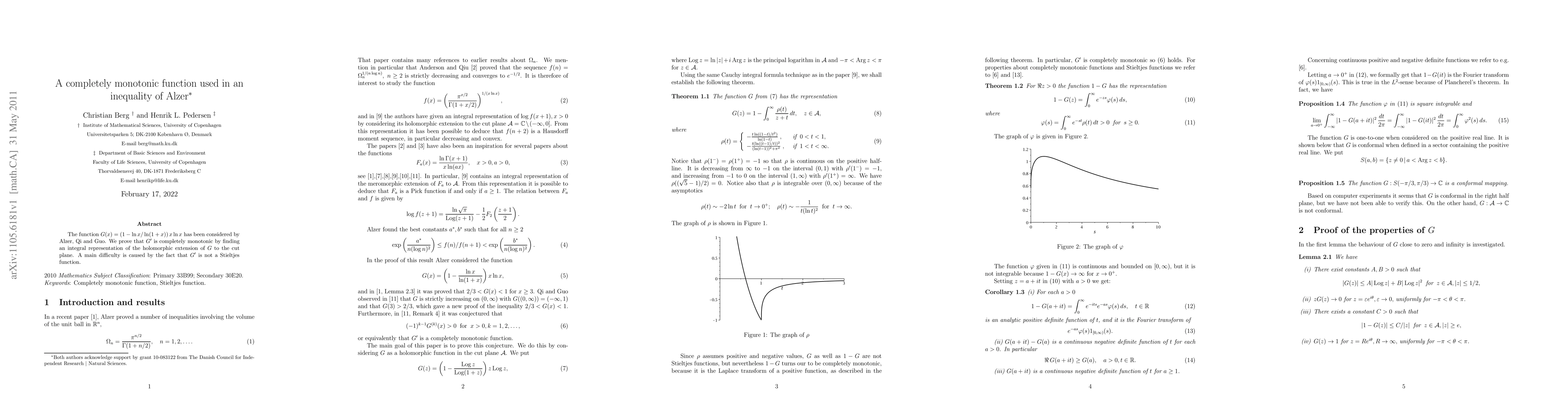 Researchers prove that a specific function $G(x)$ is completely monotonic, overcoming a challenge caused by its non-Stieltjes nature, using an integral representation of its holomorphic extension to the cut plane.