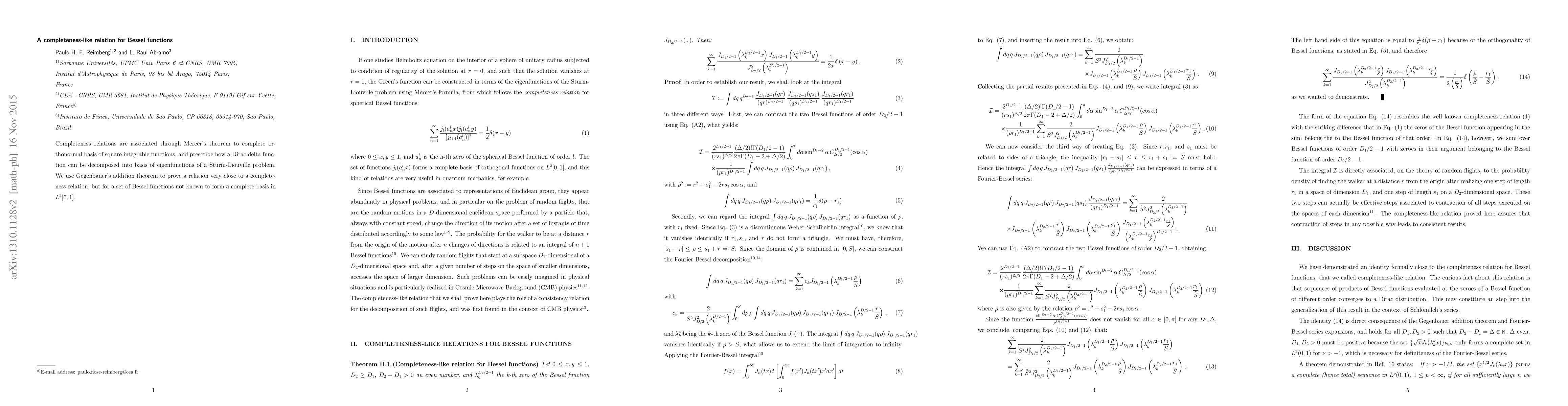 This paper explores a completeness-like relation for Bessel functions using Gegenbauer's addition theorem, demonstrating a structure akin to completeness relations typically associated with orthonormal bases in $L^2[0, 1]$. It suggests a novel decomposition method for functions, even when the Bessel functions do not form a complete basis.