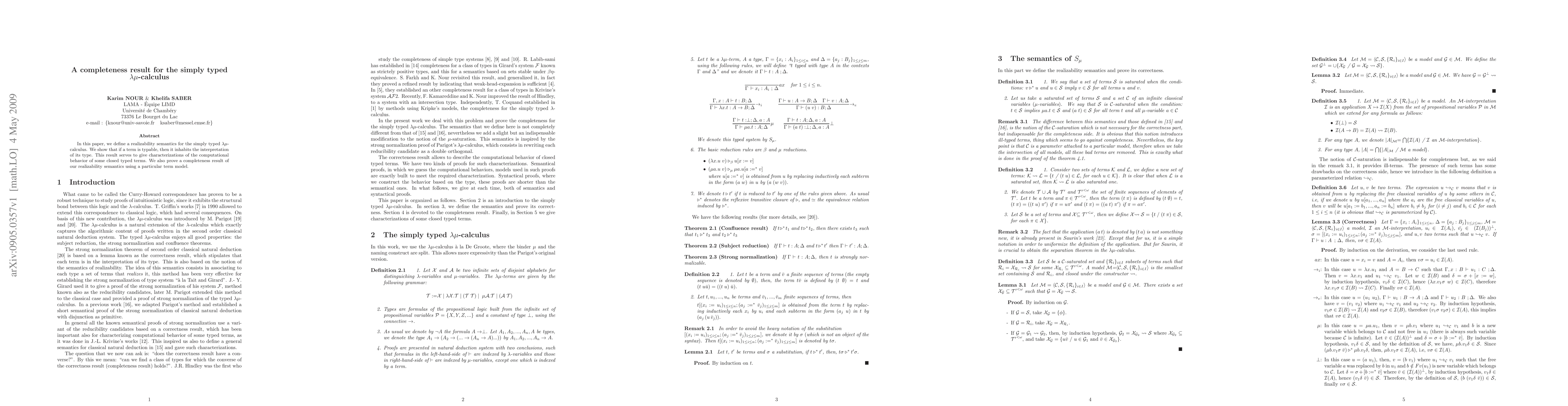 This paper establishes a realizability semantics for the simply typed $\lambda\mu$-calculus, proving that typable terms inhabit their interpreted types. It also demonstrates the completeness of this semantics through a term model, characterizing the computational behavior of certain closed typed terms.