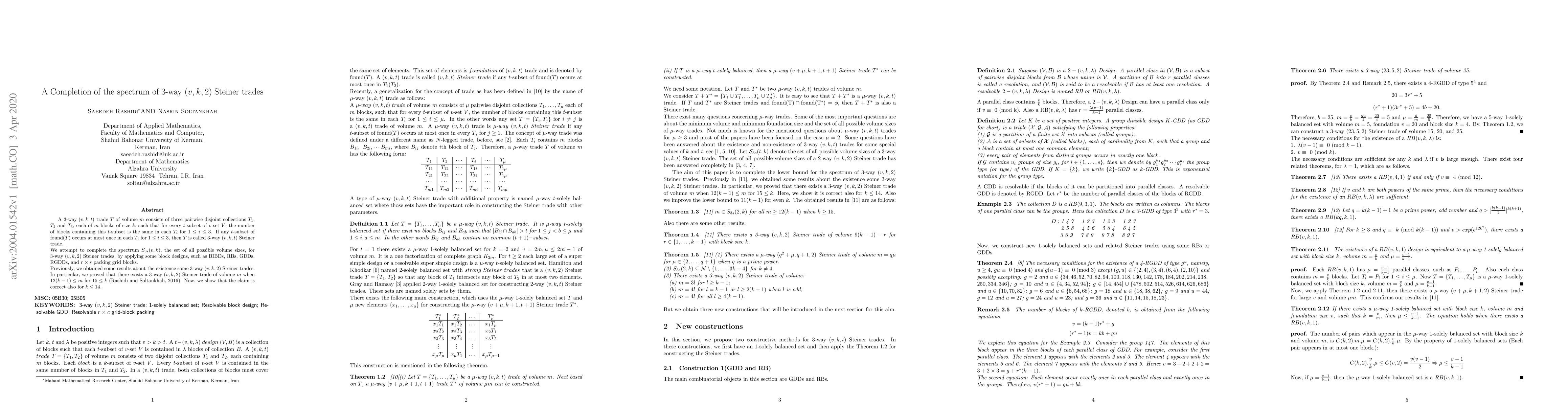 A 3-way $(v,k,t)$ trade $T$ of volume $m$ consists of three pairwise disjoint collections $T_1$, $T_2$ and $T_3$, each of $m$ blocks of size $k$, such that for every $t$-subset of $v$-set $V$, the number of blocks containing this $t$-subset is the same in each $T_i$ for $1\leq i\leq 3$. If any $t$-subset of found($T$) occurs at most once in each $T_i$ for $1\leq i\leq 3$, then $T$ is called 3-way $(v,k,t)$ Steiner trade. We attempt to complete the spectrum $S_{3s}(v,k)$, the set of all possible volume sizes, for 3-way $(v,k,2)$ Steiner trades, by applying some block designs, such as BIBDs, RBs, GDDs, RGDDs, and $r\times s$ packing grid blocks. Previously, we obtained some results about the existence some 3-way $(v,k,2)$ Steiner trades. In particular, we proved that there exists a 3-way $(v,k,2)$ Steiner trade of volume $m$ when $12(k-1)\leq m$ for $15\leq k$ (Rashidi and Soltankhah, 2016). Now, we show that the claim is correct also for $k\leq 14$.