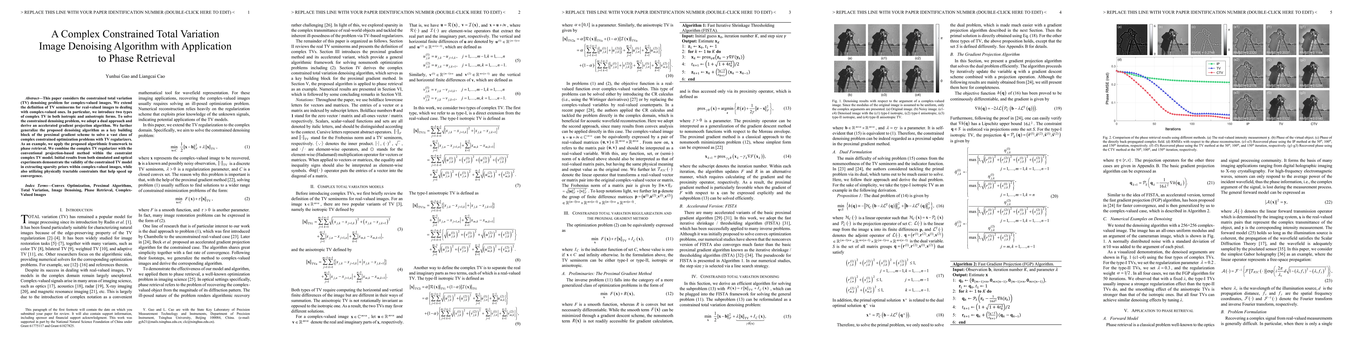 This paper proposes a complex constrained total variation (TV) denoising algorithm for complex-valued images, introducing both isotropic and anisotropic complex TV seminorms. The method employs an accelerated gradient projection algorithm and is applied to phase retrieval, demonstrating effective extraction of sparsity priors and faster convergence.
