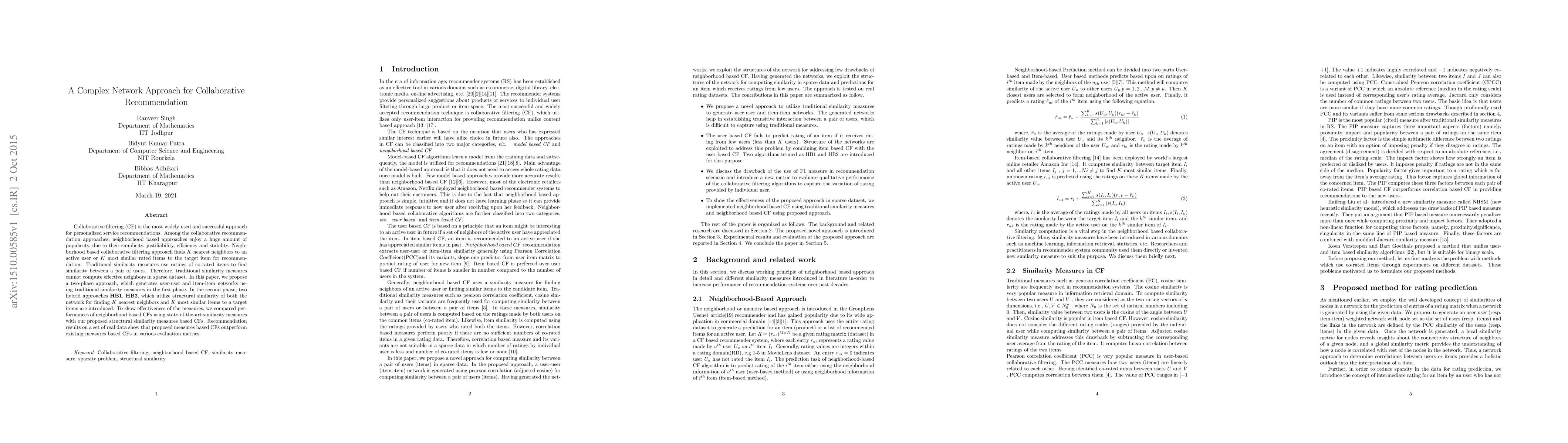 Collaborative filtering (CF) is the most widely used and successful approach for personalized service recommendations. Among the collaborative recommendation approaches, neighborhood based approaches enjoy a huge amount of popularity, due to their simplicity, justifiability, efficiency and stability. Neighborhood based collaborative filtering approach finds K nearest neighbors to an active user or K most similar rated items to the target item for recommendation. Traditional similarity measures use ratings of co-rated items to find similarity between a pair of users. Therefore, traditional similarity measures cannot compute effective neighbors in sparse dataset. In this paper, we propose a two-phase approach, which generates user-user and item-item networks using traditional similarity measures in the first phase. In the second phase, two hybrid approaches HB1, HB2, which utilize structural similarity of both the network for finding K nearest neighbors and K most similar items to a target items are introduced. To show effectiveness of the measures, we compared performances of neighborhood based CFs using state-of-the-art similarity measures with our proposed structural similarity measures based CFs. Recommendation results on a set of real data show that proposed measures based CFs outperform existing measures based CFs in various evaluation metrics.