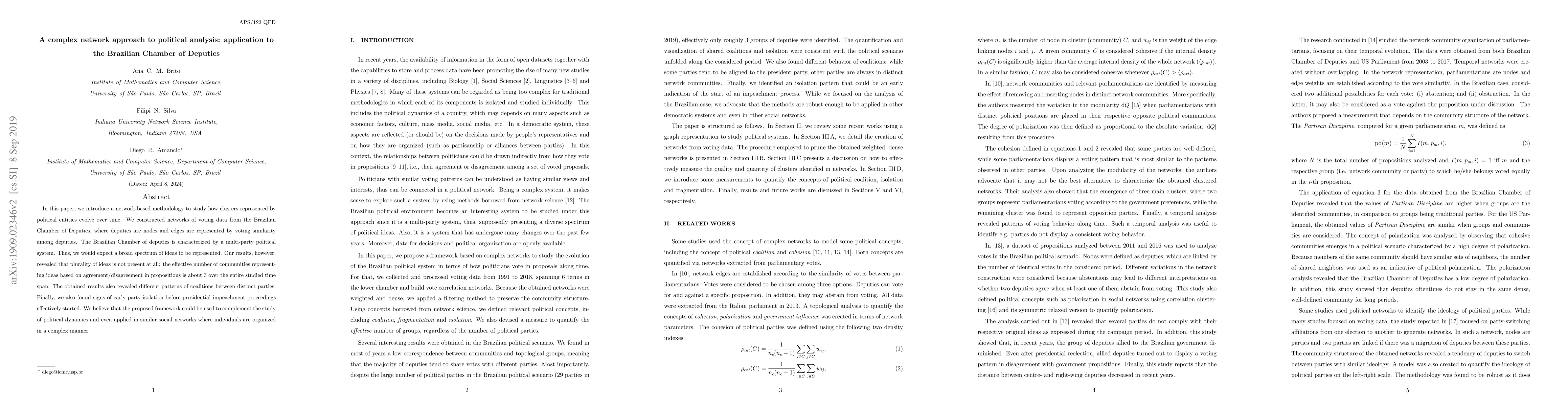 In this paper, we introduce a network-based methodology to study how clusters represented by political entities evolve over time. We constructed networks of voting data from the Brazilian Chamber of Deputies, where deputies are nodes and edges are represented by voting similarity among deputies. The Brazilian Chamber of deputies is characterized by a multi-party political system. Thus, we would expect a broad spectrum of ideas to be represented. Our results, however, revealed that plurality of ideas is not present at all: the effective number of communities representing ideas based on agreement/disagreement in propositions is about 3 over the entire studied time span. The obtained results also revealed different patterns of coalitions between distinct parties. Finally, we also found signs of early party isolation before presidential impeachment proceedings effectively started. We believe that the proposed framework could be used to complement the study of political dynamics and even applied in similar social networks where individuals are organized in a complex manner.