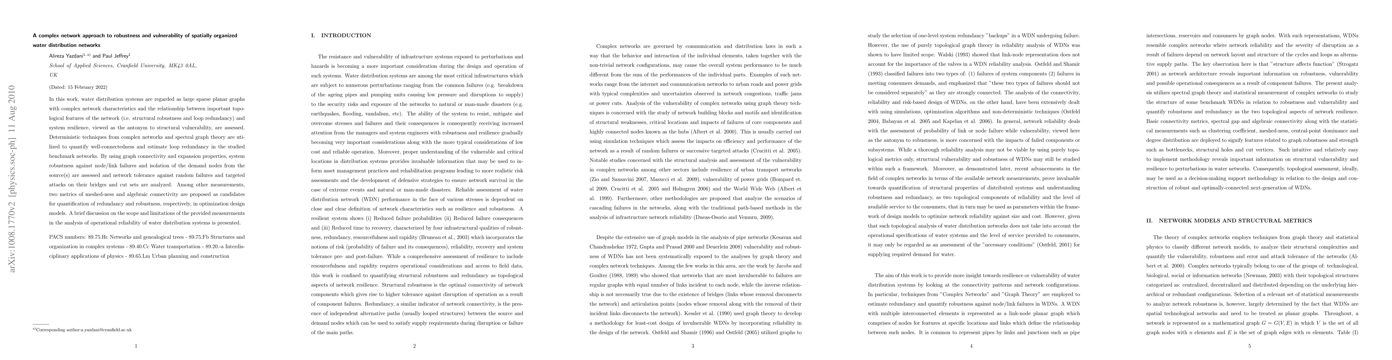 In this work, water distribution systems are regarded as large sparse planar graphs with complex network characteristics and the relationship between important topological features of the network (i.e. structural robustness and loop redundancy) and system resilience, viewed as the antonym to structural vulnerability, are assessed. Deterministic techniques from complex networks and spectral graph theory are utilized to quantify well-connectedness and estimate loop redundancy in the studied benchmark networks. By using graph connectivity and expansion properties, system robustness against node/link failures and isolation of the demand nodes from the source(s) are assessed and network tolerance against random failures and targeted attacks on their bridges and cut sets are analyzed. Among other measurements, two metrics of meshed-ness and algebraic connectivity are proposed as candidates for quantification of redundancy and robustness, respectively, in optimization design models. A brief discussion on the scope and limitations of the provided measurements in the analysis of operational reliability of water distribution systems is presented.
