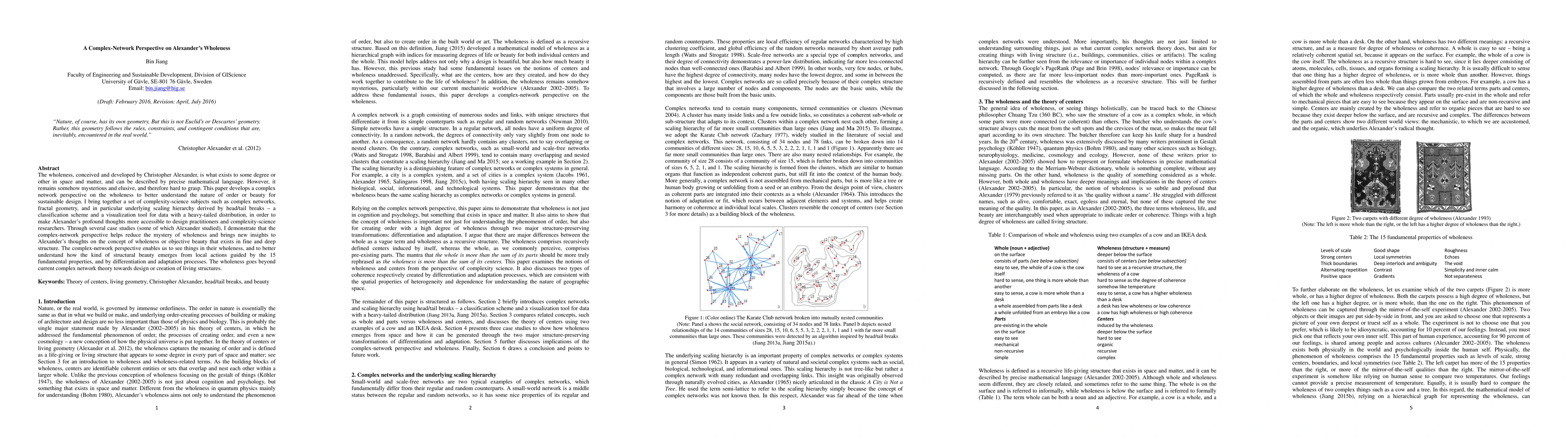 This paper applies complex network theory to elucidate Christopher Alexander's concept of wholeness, demonstrating how fractal geometry and scaling hierarchies can make Alexander's ideas more accessible. Through case studies, it reveals how a complex-network perspective can enhance understanding of structural beauty in sustainable design.