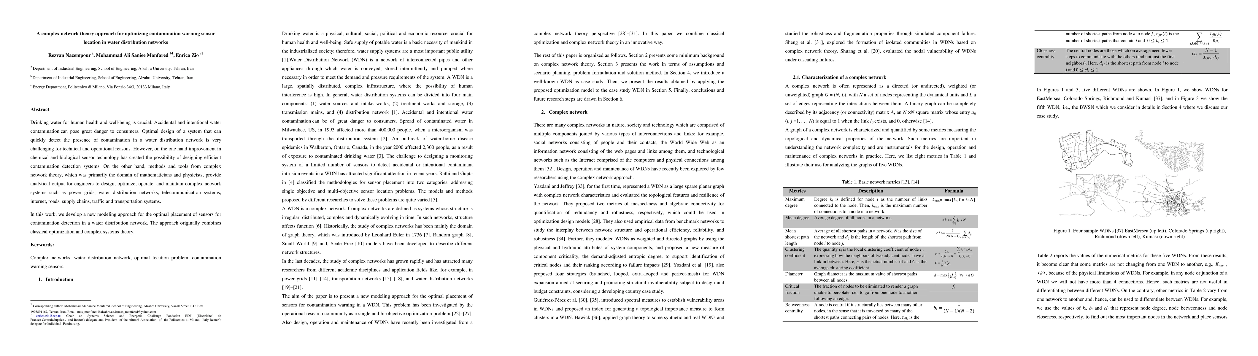 This paper proposes a novel modeling approach that integrates complex network theory and classical optimization to determine the optimal placement of contamination warning sensors in water distribution networks, aiming to enhance the detection of accidental or intentional water contamination. The method leverages analytical tools from complex network theory to improve the design and operation of efficient contamination detection systems.