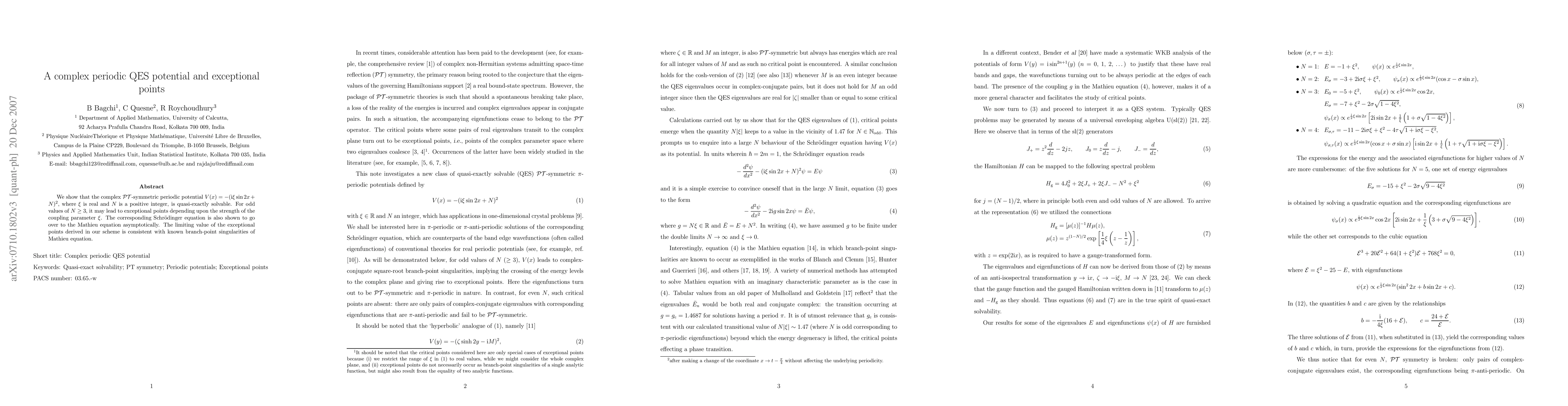 The paper presents a novel QES $\cal PT$-symmetric periodic potential and establishes its connection to the Mathieu equation, providing insights into exceptional points and their relation to branch-point singularities.