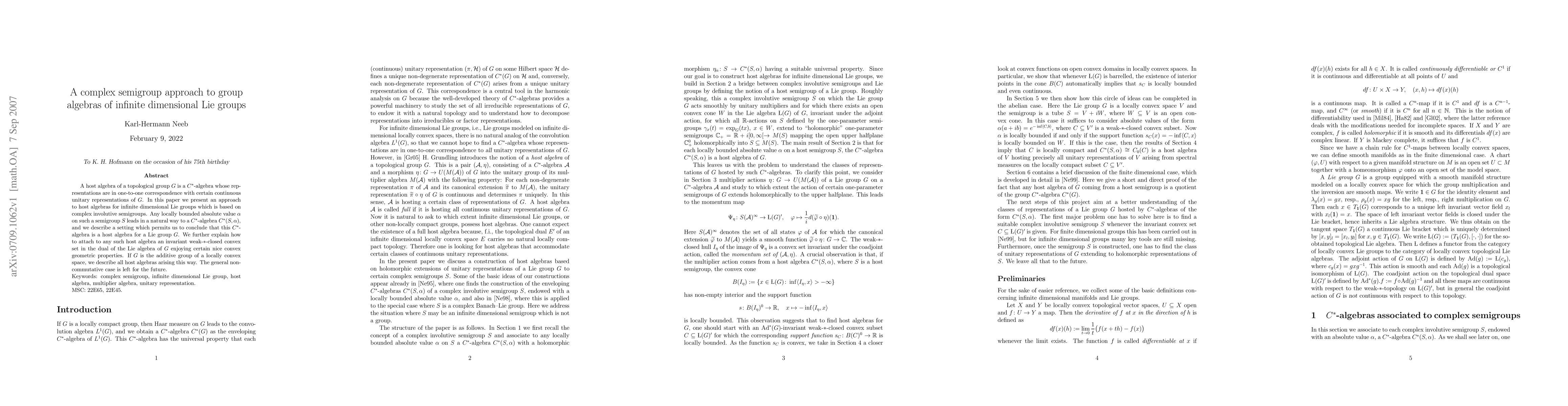 This paper introduces a complex semigroup approach to construct host algebras for infinite dimensional Lie groups, using complex involutive semigroups and locally bounded absolute values. It establishes a connection between these C^*-algebras and continuous unitary representations of the Lie groups, and explores the geometric properties of associated convex sets in the dual of the Lie algebra.