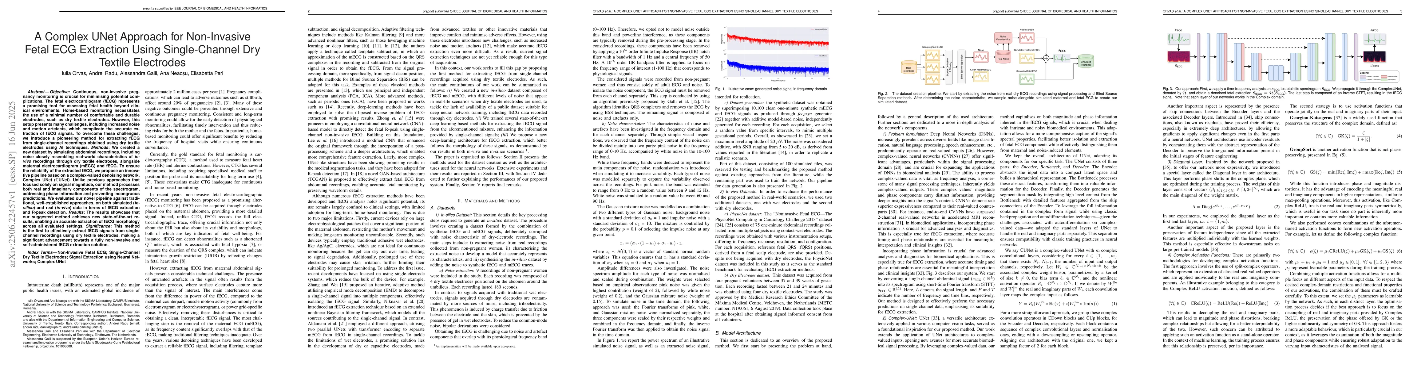 Continuous, non-invasive pregnancy monitoring is crucial for minimising potential complications. The fetal electrocardiogram (fECG) represents a promising tool for assessing fetal health beyond clinical environments. Home-based monitoring necessitates the use of a minimal number of comfortable and durable electrodes, such as dry textile electrodes. However, this setup presents many challenges, including increased noise and motion artefacts, which complicate the accurate extraction of fECG signals. To overcome these challenges, we introduce a pioneering method for extracting fECG from single-channel recordings obtained using dry textile electrodes using AI techniques. We created a new dataset by simulating abdominal recordings, including noise closely resembling real-world characteristics of in-vivo recordings through dry textile electrodes, alongside mECG and fECG. To ensure the reliability of the extracted fECG, we propose an innovative pipeline based on a complex-valued denoising network, Complex UNet. Unlike previous approaches that focused solely on signal magnitude, our method processes both real and imaginary components of the spectrogram, addressing phase information and preventing incongruous predictions. We evaluated our novel pipeline against traditional, well-established approaches, on both simulated and real data in terms of fECG extraction and R-peak detection. The results showcase that our suggested method achieves new state-of-the-art results, enabling an accurate extraction of fECG morphology across all evaluated settings. This method is the first to effectively extract fECG signals from single-channel recordings using dry textile electrodes, making a significant advancement towards a fully non-invasive and self-administered fECG extraction solution.