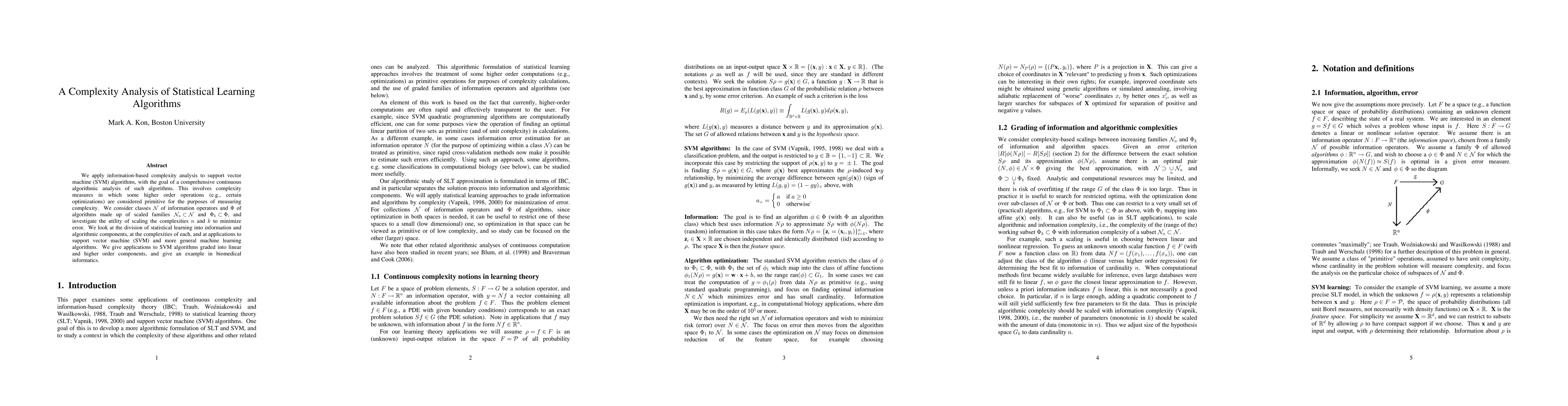 This paper uses complexity analysis to study how statistical learning algorithms like support vector machines work, aiming to minimize error and improve performance. It provides new insights into the information and algorithmic components of these algorithms, with potential applications in machine learning and biomedical informatics.