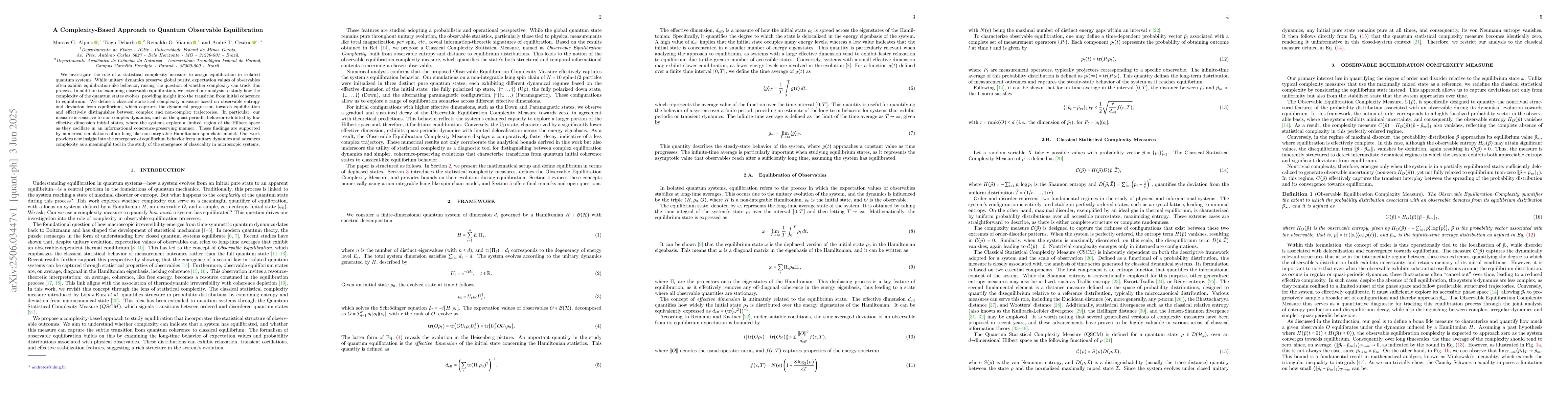 We investigate the role of a statistical complexity measure to assign equilibration in isolated quantum systems. While unitary dynamics preserve global purity, expectation values of observables often exhibit equilibration-like behavior, raising the question of whether complexity can track this process. In addition to examining observable equilibration, we extend our analysis to study how the complexity of the quantum states evolves, providing insight into the transition from initial coherence to equilibrium. We define a classical statistical complexity measure based on observable entropy and deviation from equilibrium, which captures the dynamical progression towards equilibration and effectively distinguishes between complex and non-complex trajectories. In particular, our measure is sensitive to non-complex dynamics, such as the quasi-periodic behavior exhibited by low effective dimension initial states, where the systems explore a limited region of the Hilbert space as they oscillate in an informational coherence-preserving manner. These findings are supported by numerical simulations of an Ising-like non-integrable Hamiltonian spin-chain model. Our work provides new insight into the emergence of equilibrium behavior from unitary dynamics and advances complexity as a meaningful tool in the study of the emergence of classicality in microscopic systems.