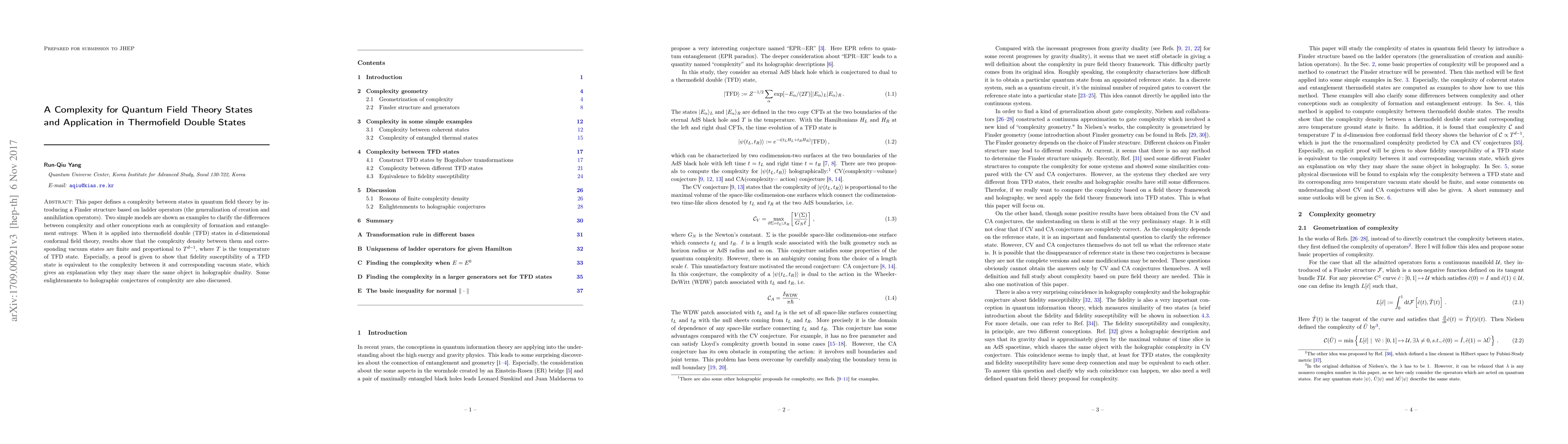 This paper defines a complexity between states in quantum field theory by introducing a Finsler structure based on ladder operators (the generalization of creation and annihilation operators). Two simple models are shown as examples to clarify the differences between complexity and other conceptions such as complexity of formation and entanglement entropy. When it is applied into thermofield double (TFD) states in $d$-dimensional conformal field theory, results show that the complexity density between them and corresponding vacuum states are finite and proportional to $T^{d-1}$, where $T$ is the temperature of TFD state. Especially, a proof is given to show that fidelity susceptibility of a TFD state is equivalent to the complexity between it and corresponding vacuum state, which gives an explanation why they may share the same object in holographic duality. Some enlightenments to holographic conjectures of complexity are also discussed.