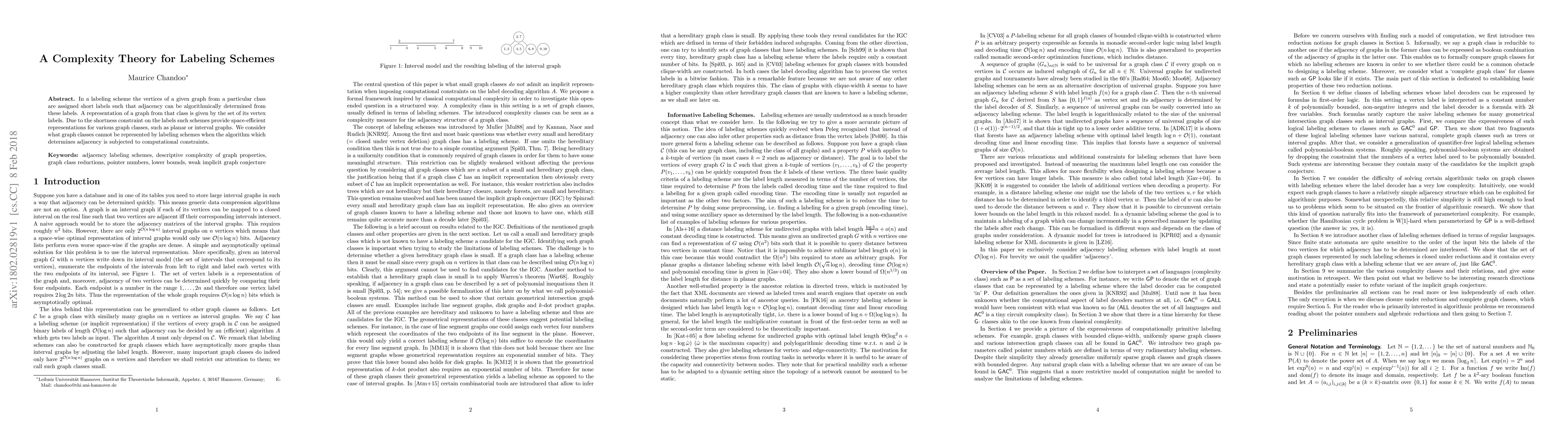 The paper presents a complexity theory for labeling schemes, focusing on graph classes that cannot be represented under computational constraints on the adjacency-determining algorithm. It introduces and analyzes graph classes closed under Boolean functions and subsets, negation, and conjunction.
