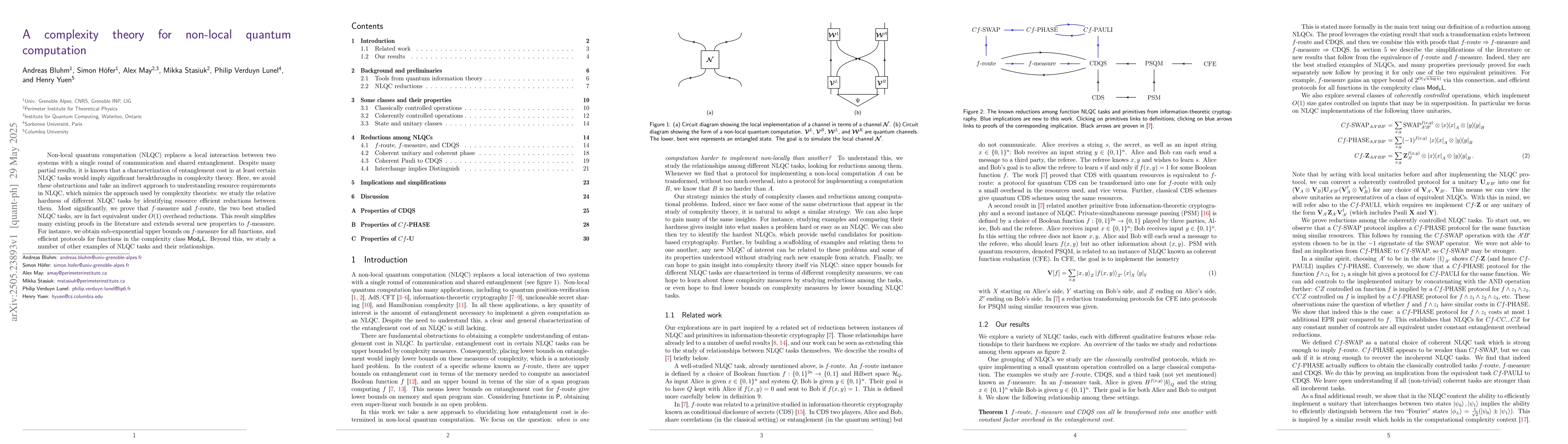 This research paper introduces a complexity theory approach to analyze non-local quantum computation (NLQC) tasks, avoiding previous obstructions. The key finding is the equivalence of two best-studied NLQC tasks, f-measure and f-route, under O(1) overhead reductions. This simplifies existing proofs and extends new properties to f-measure, offering sub-exponential upper bounds and efficient protocols for certain function classes.