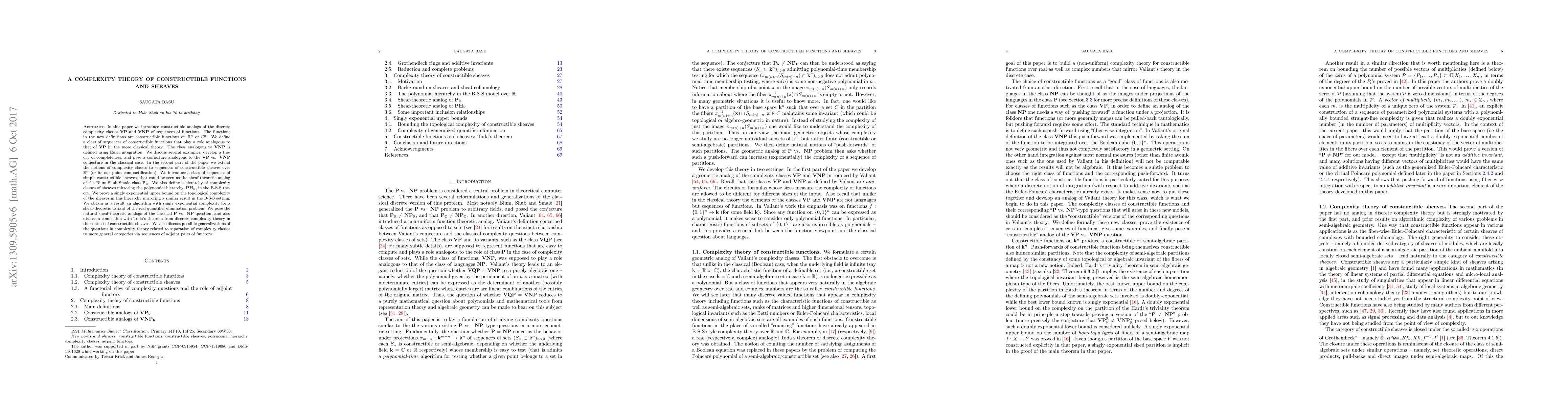 In this paper we introduce constructible analogs of the discrete complexity classes $\mathbf{VP}$ and $\mathbf{VNP}$ of sequences of functions. The functions in the new definitions are constructible functions on $\mathbb{R}^n$ or $\mathbb{C}^n$. We define a class of sequences of constructible functions that play a role analogous to that of $\mathbf{VP}$ in the more classical theory. The class analogous to $\mathbf{VNP}$ is defined using Euler integration. We discuss several examples, develop a theory of completeness, and pose a conjecture analogous to the $\mathbf{VP}$ vs. $\mathbf{VNP}$ conjecture in the classical case. In the second part of the paper we extend the notions of complexity classes to sequences of constructible sheaves over $\mathbb{R}^n$ (or its one point compactification). We introduce a class of sequences of simple constructible sheaves, that could be seen as the sheaf-theoretic analog of the Blum-Shub-Smale class $\mathbf{P}_{\mathbb{R}}$. We also define a hierarchy of complexity classes of sheaves mirroring the polynomial hierarchy, $\mathbf{PH}_{\mathbb{R}}$, in the B-S-S theory. We prove a singly exponential upper bound on the topological complexity of the sheaves in this hierarchy mirroring a similar result in the B-S-S setting. We obtain as a result an algorithm with singly exponential complexity for a sheaf-theoretic variant of the real quantifier elimination problem. We pose the natural sheaf-theoretic analogs of the classical $\mathbf{P}$ vs. $\mathbf{NP}$ question, and also discuss a connection with Toda's theorem from discrete complexity theory in the context of constructible sheaves. We also discuss possible generalizations of the questions in complexity theory related to separation of complexity classes to more general categories via sequences of adjoint pairs of functors.
