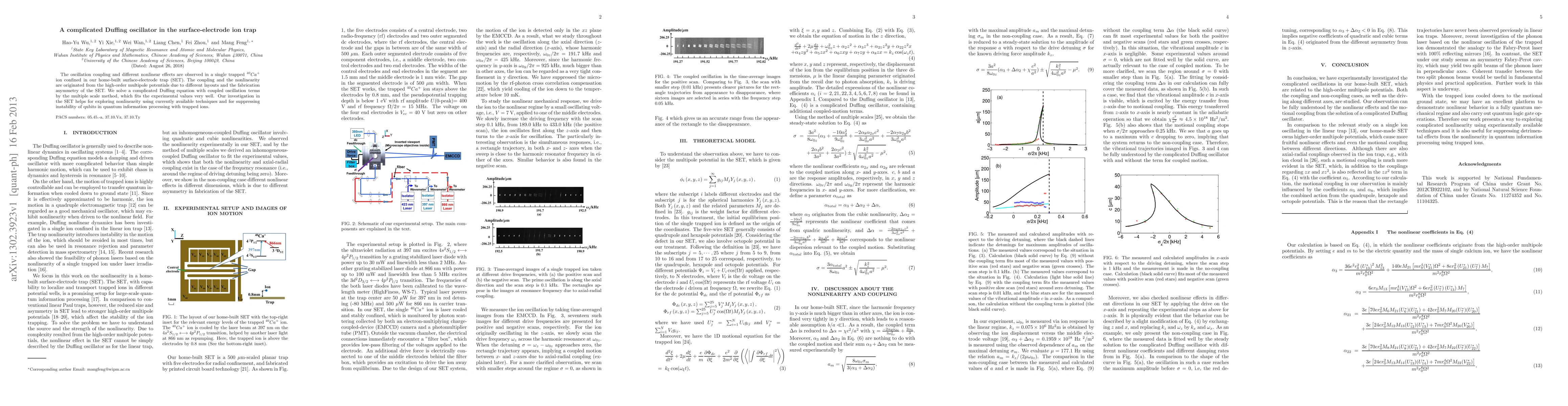 This study investigates oscillation coupling and nonlinear effects in a surface-electrode ion trap (SET) with a single trapped $^{40}Ca^{+}$ ion, attributing these phenomena to the trap's high-order multipole potentials. The researchers solve a complex Duffing equation using the multiple scale method, providing insights for enhancing nonlinearity exploration and stabilizing qubits in quantum information processing.
