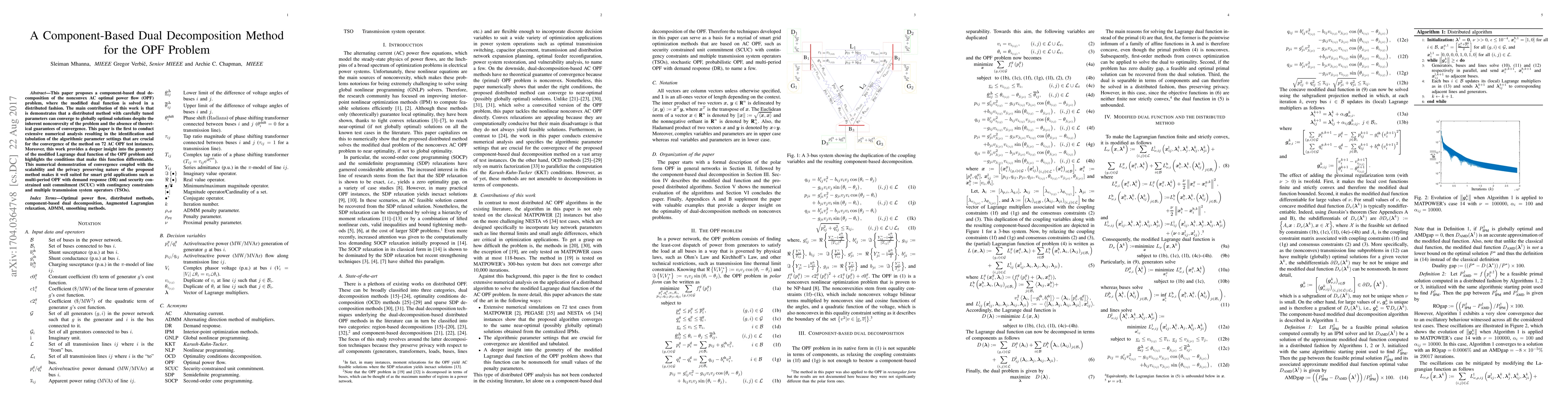 This paper introduces a component-based dual decomposition method for solving the nonconvex AC optimal power flow (OPF) problem, demonstrating its convergence to global optima through extensive numerical analysis. The method's scalability and privacy-preserving nature make it suitable for smart grid applications like multi-period OPF and security-constrained unit commitment.