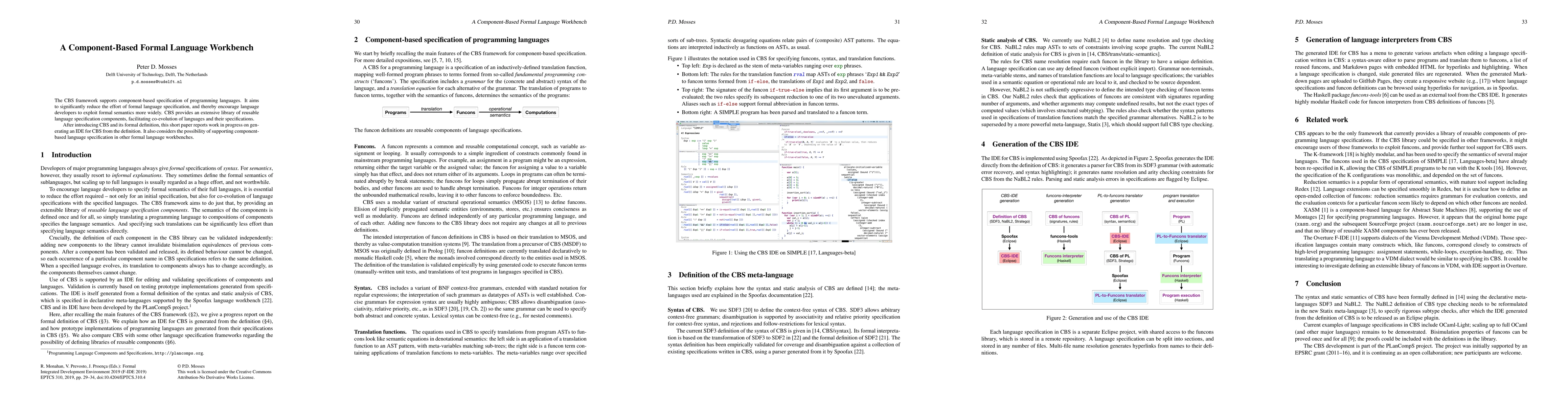 The CBS framework supports component-based specification of programming languages. It aims to significantly reduce the effort of formal language specification, and thereby encourage language developers to exploit formal semantics more widely. CBS provides an extensive library of reusable language specification components, facilitating co-evolution of languages and their specifications. After introducing CBS and its formal definition, this short paper reports work in progress on generating an IDE for CBS from the definition. It also considers the possibility of supporting component-based language specification in other formal language workbenches.