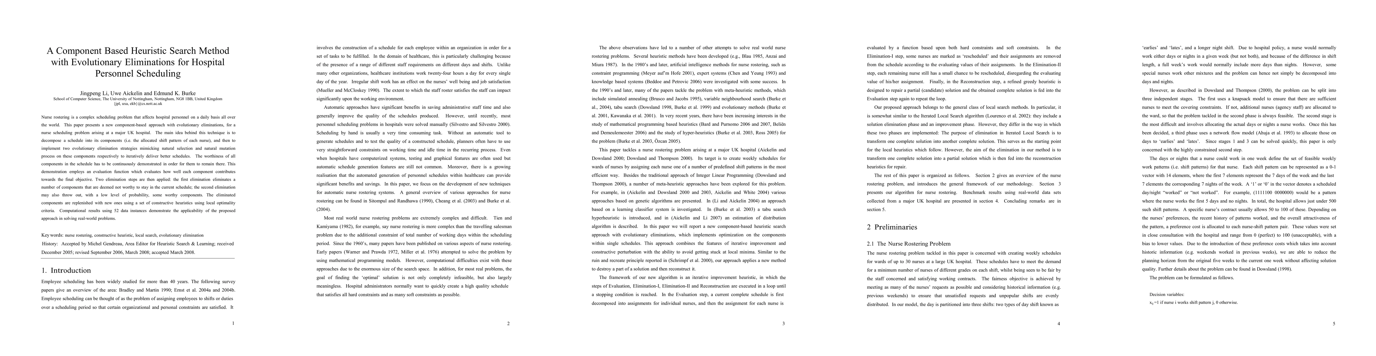 Nurse rostering is a complex scheduling problem that affects hospital personnel on a daily basis all over the world. This paper presents a new component-based approach with evolutionary eliminations, for a nurse scheduling problem arising at a major UK hospital. The main idea behind this technique is to decompose a schedule into its components (i.e. the allocated shift pattern of each nurse), and then to implement two evolutionary elimination strategies mimicking natural selection and natural mutation process on these components respectively to iteratively deliver better schedules. The worthiness of all components in the schedule has to be continuously demonstrated in order for them to remain there. This demonstration employs an evaluation function which evaluates how well each component contributes towards the final objective. Two elimination steps are then applied: the first elimination eliminates a number of components that are deemed not worthy to stay in the current schedule; the second elimination may also throw out, with a low level of probability, some worthy components. The eliminated components are replenished with new ones using a set of constructive heuristics using local optimality criteria. Computational results using 52 data instances demonstrate the applicability of the proposed approach in solving real-world problems.