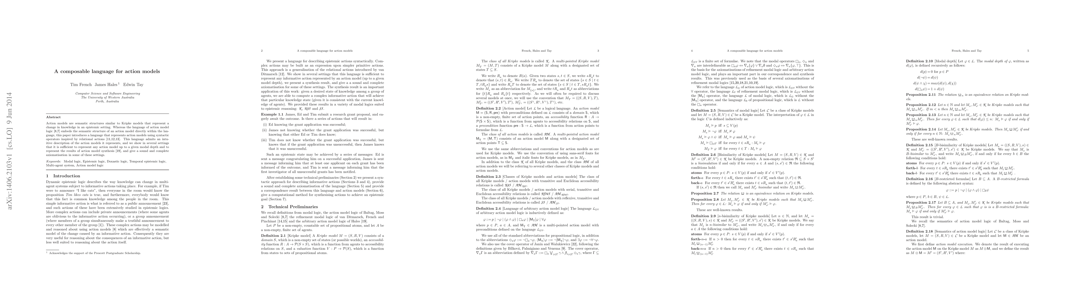 A new language is introduced to represent action models using syntactic operators, allowing for intuitive descriptions and representing various action model structures up to a given modal depth.