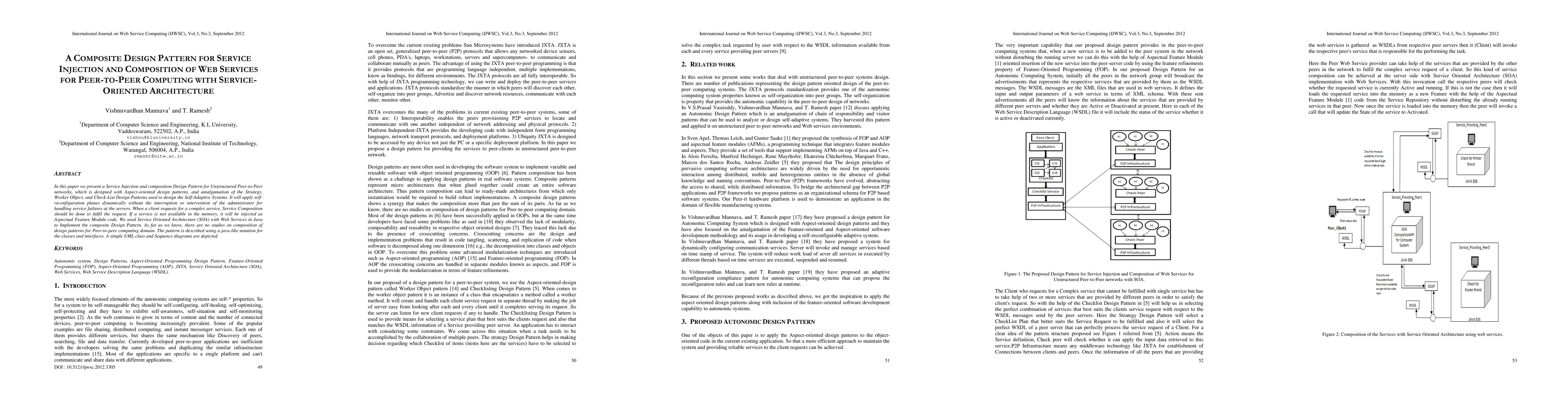 This paper introduces a composite design pattern for dynamically injecting and composing services in unstructured peer-to-peer networks using SOA and Web Services. The pattern combines Strategy, Worker Object, and Check-List patterns to enable self-reconfiguration and service failure handling without administrator intervention.