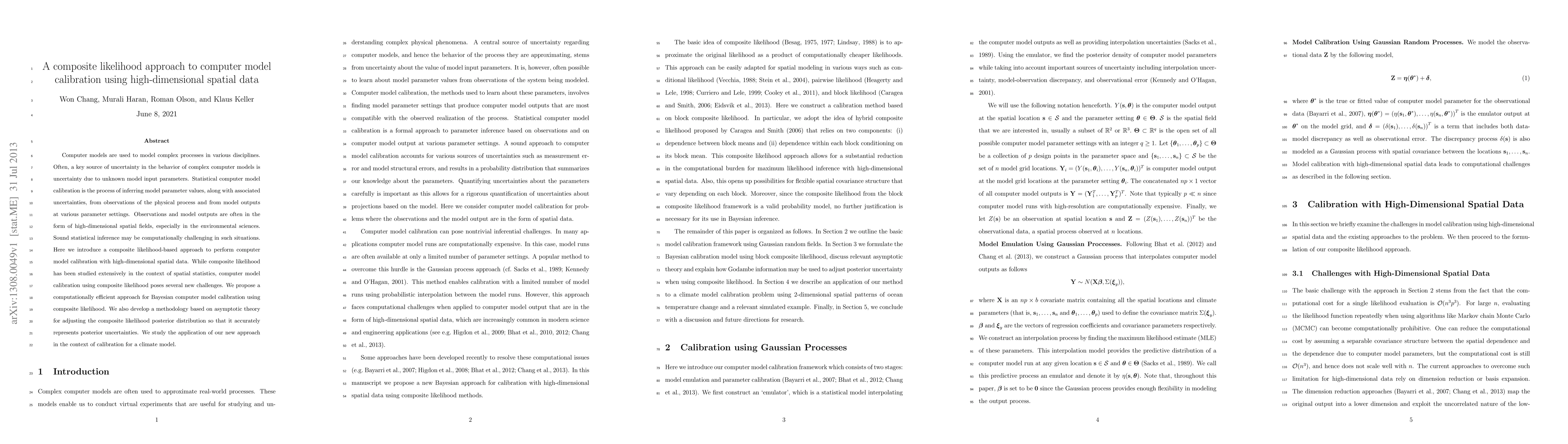 This paper proposes a composite likelihood approach for calibrating complex computer models using high-dimensional spatial data, addressing computational challenges through a Bayesian method. It also develops a methodology to adjust the composite likelihood posterior for accurate uncertainty representation, demonstrated through a climate model calibration.