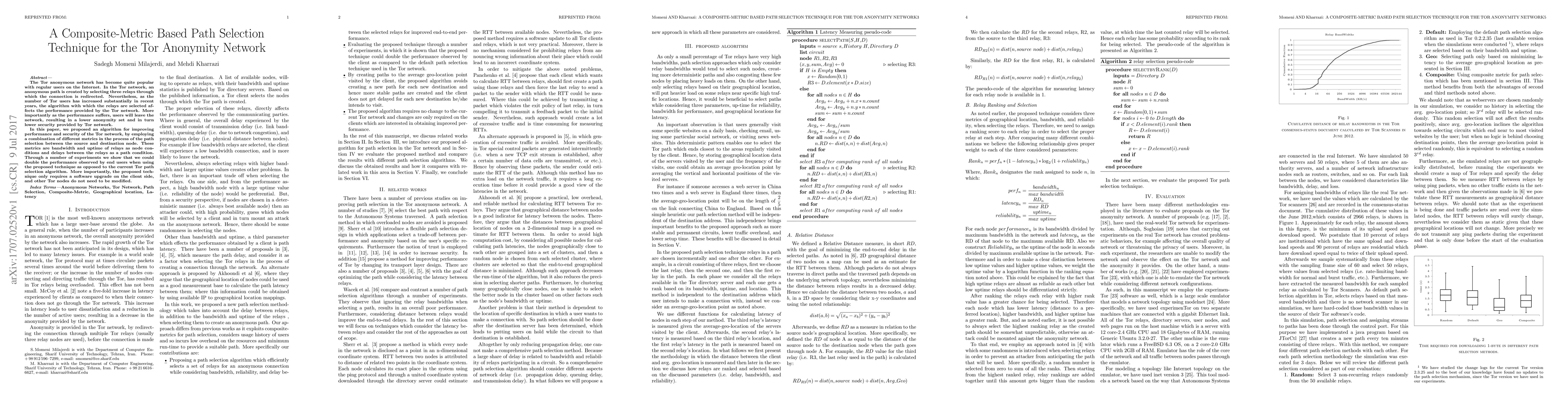 This paper proposes a new composite-metric based path selection technique for the Tor network to enhance performance and security by combining relay bandwidth, uptime, and inter-relay delays. Experimental results show a doubling of performance compared to the current algorithm, with minimal changes required, only needing a client-side upgrade.