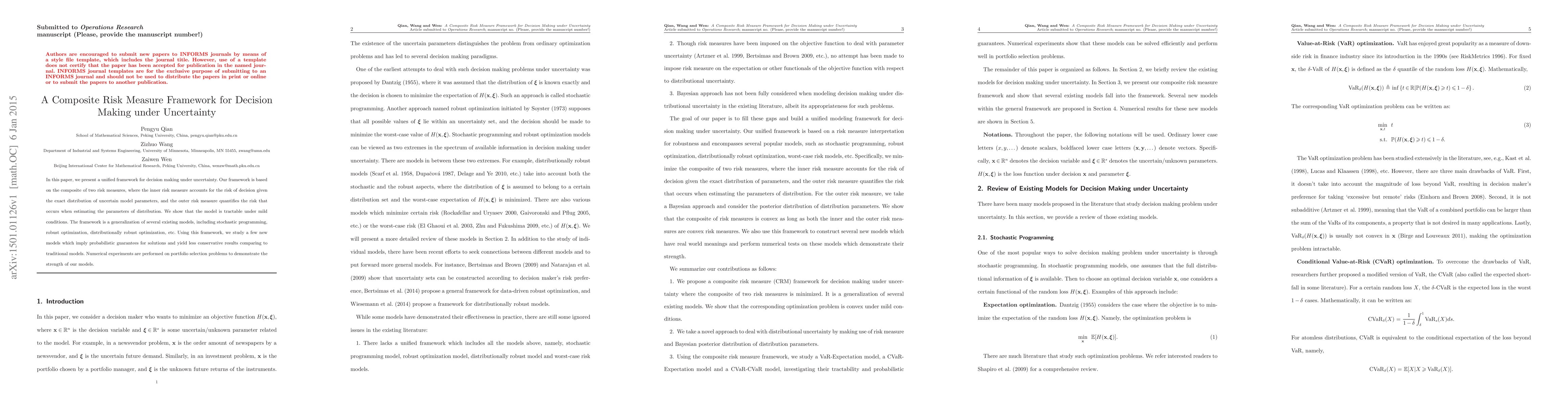 In this paper, we present a unified framework for decision making under uncertainty. Our framework is based on the composite of two risk measures, where the inner risk measure accounts for the risk of decision given the exact distribution of uncertain model parameters, and the outer risk measure quantifies the risk that occurs when estimating the parameters of distribution. We show that the model is tractable under mild conditions. The framework is a generalization of several existing models, including stochastic programming, robust optimization, distributionally robust optimization, etc. Using this framework, we study a few new models which imply probabilistic guarantees for solutions and yield less conservative results comparing to traditional models. Numerical experiments are performed on portfolio selection problems to demonstrate the strength of our models.